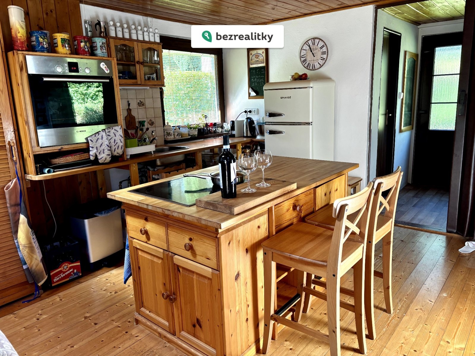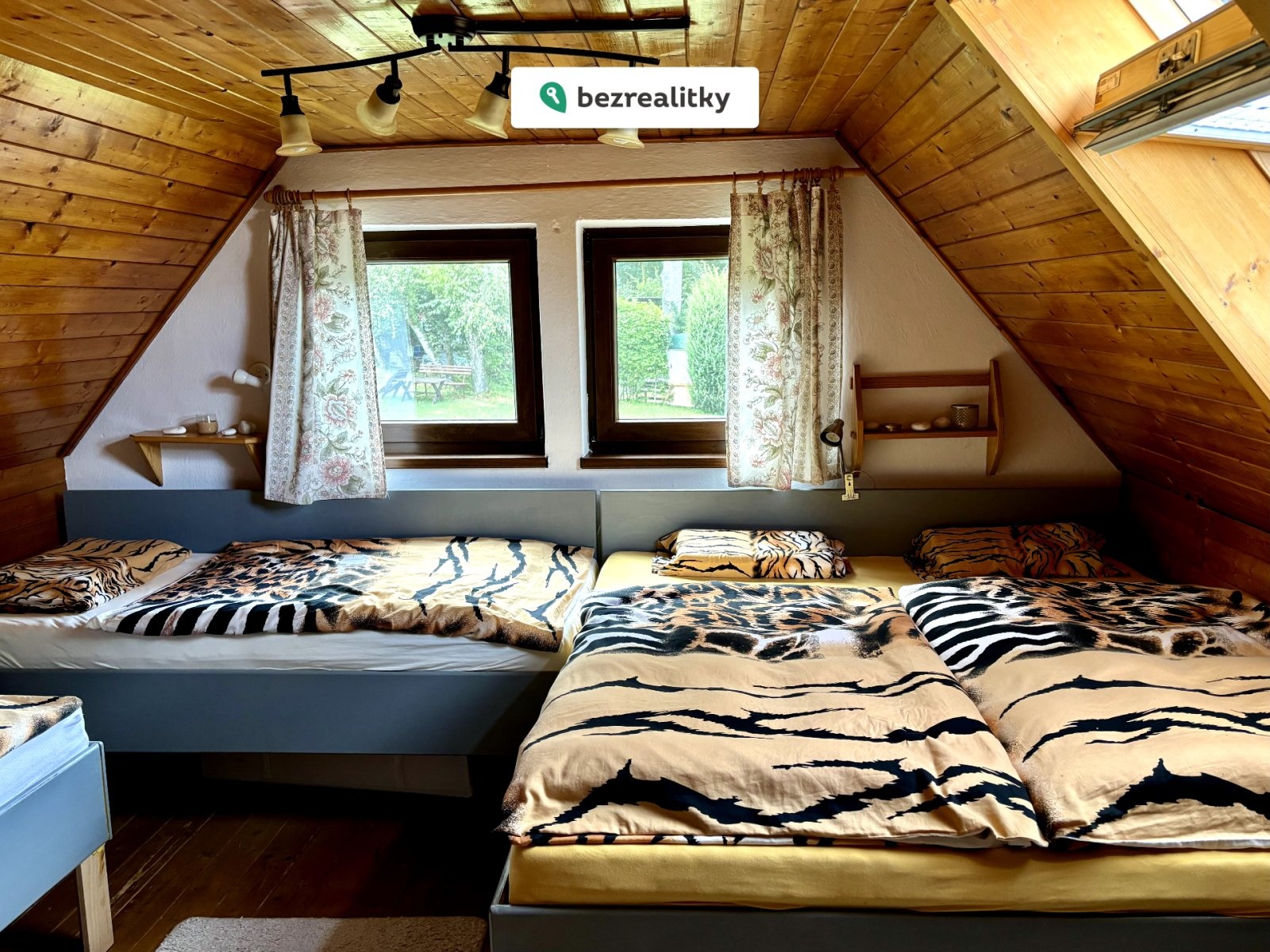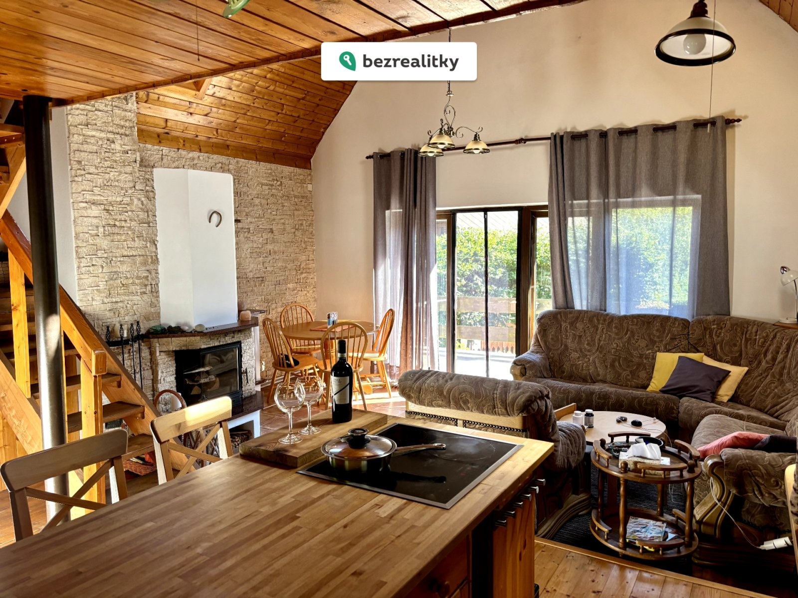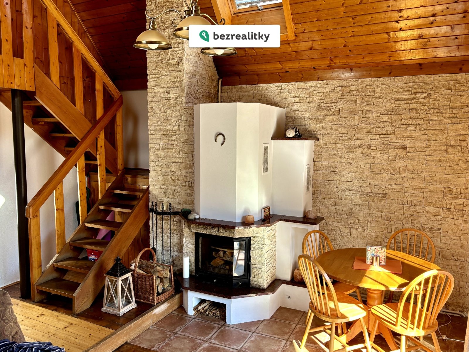 Přízemí dominuje vzdušný obývací pokoj s krbem, který dodává místu příjemnou atmosféru, a vstupem na zastřešenou terasu, přímo vybízející k posezení u sklenky vína. Na obývací pokoj plynule navazuje jídelní a kuchyňský kout. Kuchyně je vybavena vestavěnou troubou, varným ostrůvkem a stylovou lednicí s mrazákem. V přízemí se dále nachází předsíň, menší ložnice a nově zrekonstruovaná koupelna se sprchovým koutem. V patře pak najdete velkou ložnici se čtyřmi lůžky, která poskytuje pohodlné zázemí. Součástí chaty je také menší sklep, přímo přístupný z obývacího pokoje.