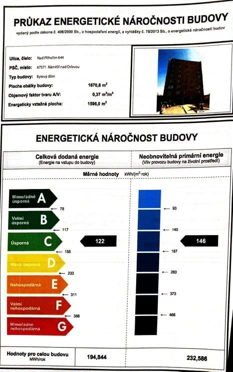 Ukazatel energetické náročnosti budovy:122 kWh/m²