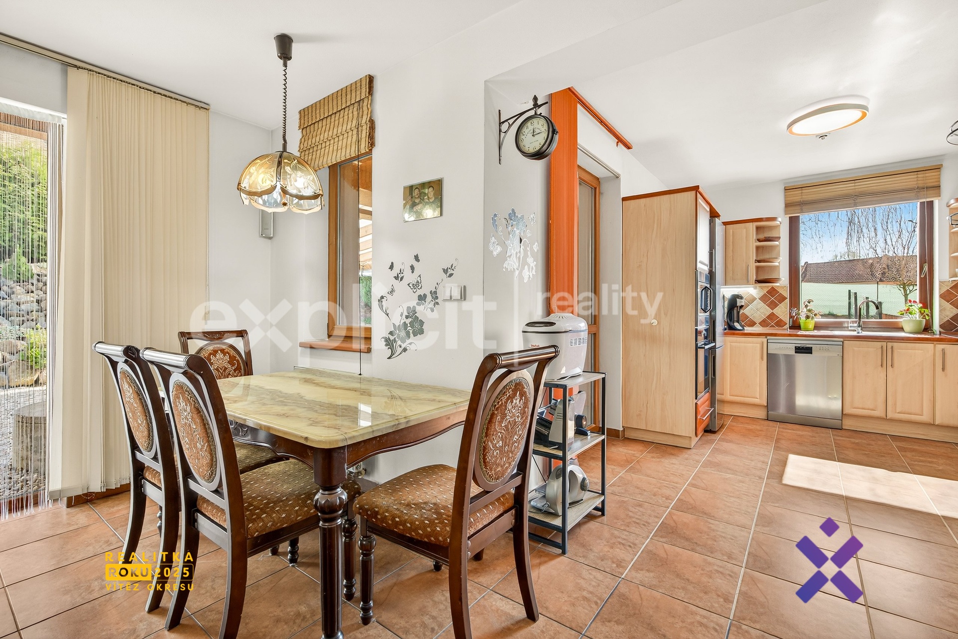 Obytná část domu je řešena velmi prakticky. V přízemí se nachází kuchyňská linka propojená s prostorným obývacím pokojem, který tvoří přirozené centrum domova. Dále zde najdete koupelnu se sprchovým koutem a toaletou. V druhém patře jsou k dispozici 3 prostorné pokoje, šatna a koupelna s vanou, což zajišťuje dostatek prostoru i pro větší rodinu. Každý pokoj v domě je navíc vybaven klimatizací, což výrazně zvyšuje komfort bydlení zejména v letních měsících. Z kuchyně je navíc přímý vstup na zastřešenou terasu navazující na velkou zahradu s bazénem. Ta nabízí ideální místo pro relaxaci, rodinné chvíle i letní posezení s přáteli. Součástí zahrady je také praktický zahradní domek pro uskladnění nářadí a sezónních věcí.