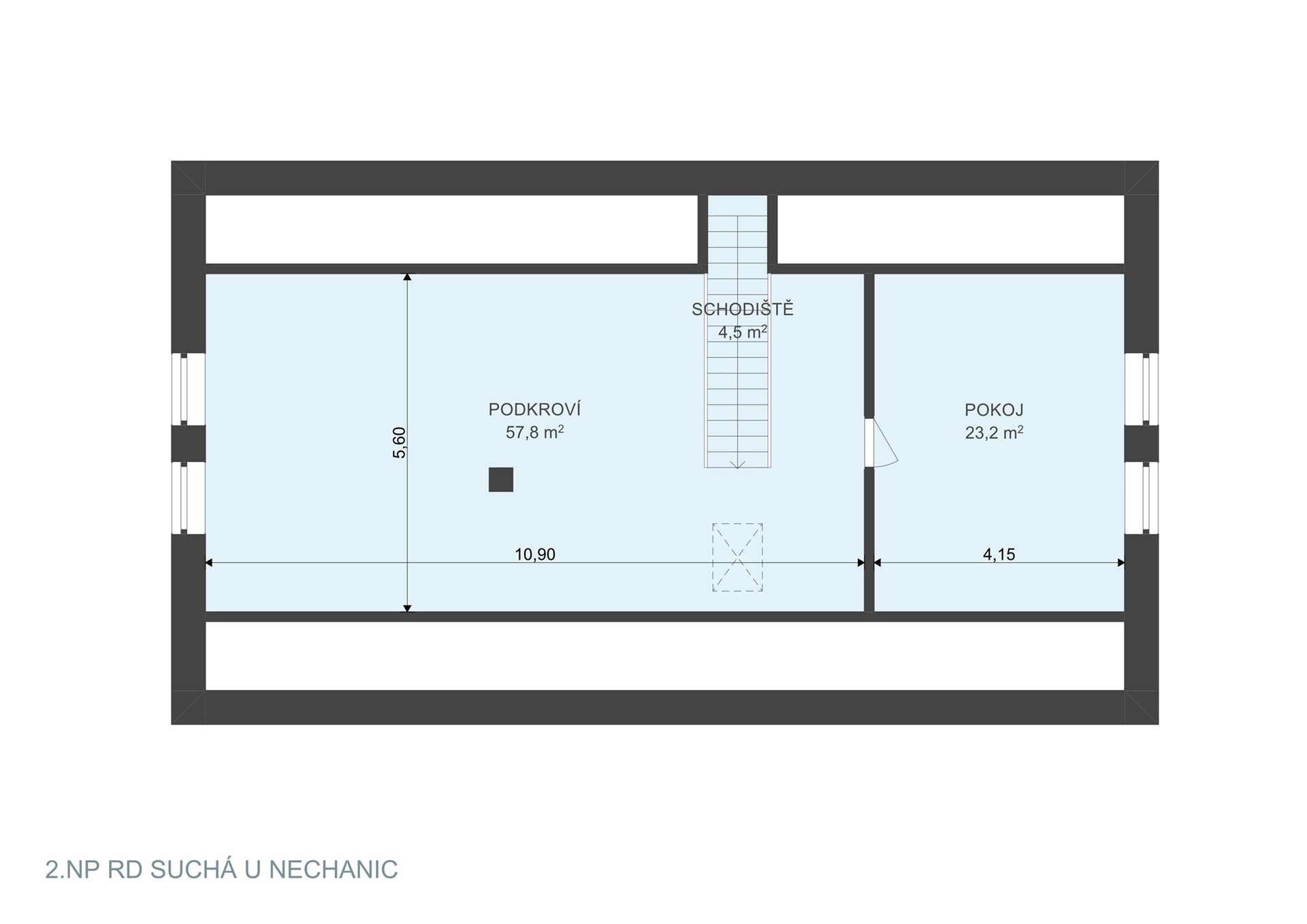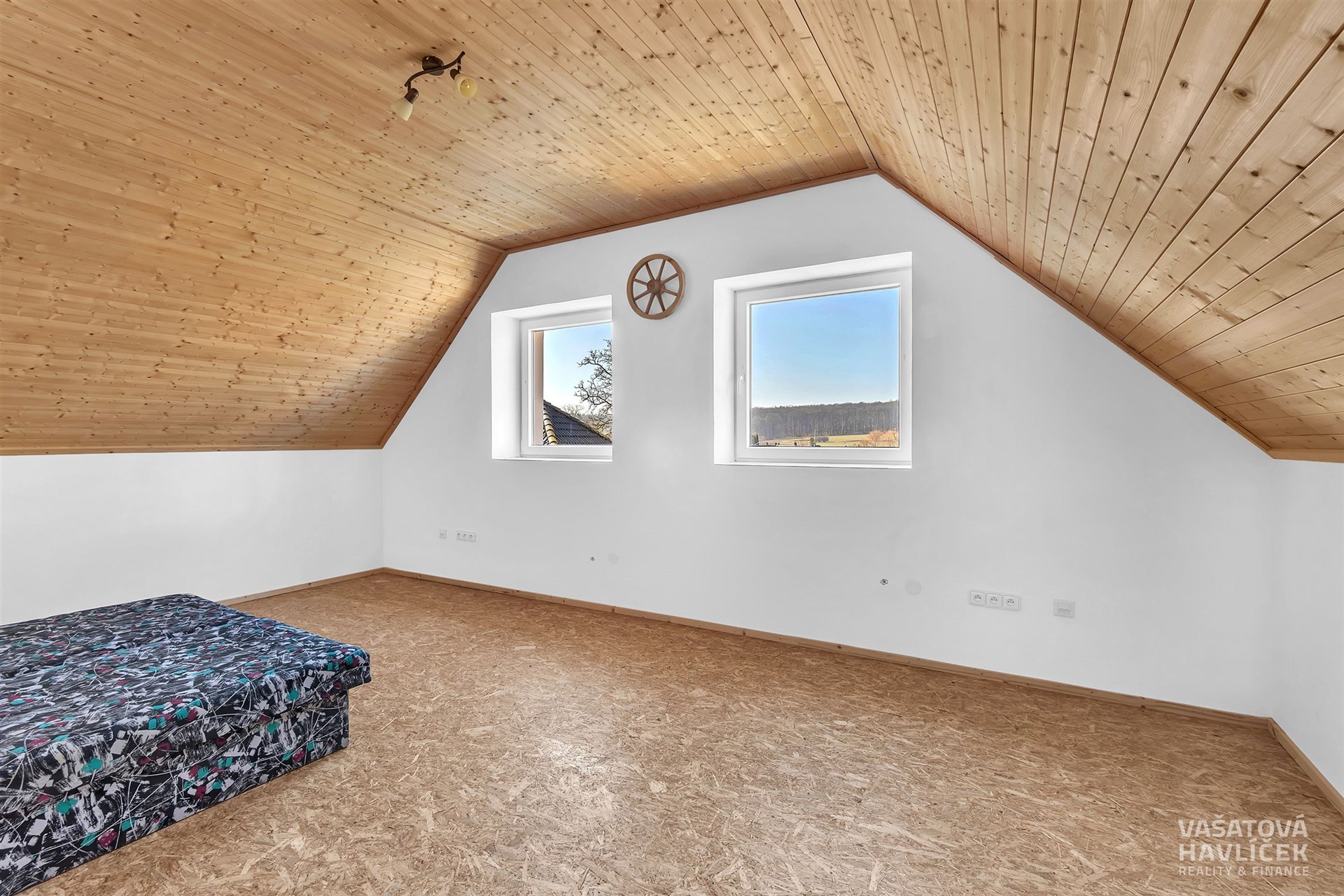 V podkroví (cca 81 m²) je velká hala a samostatný pokoj, které lze využít dle vlastních představ. Podlahovou krytinu zde tvoří dřevovláknitá deska.