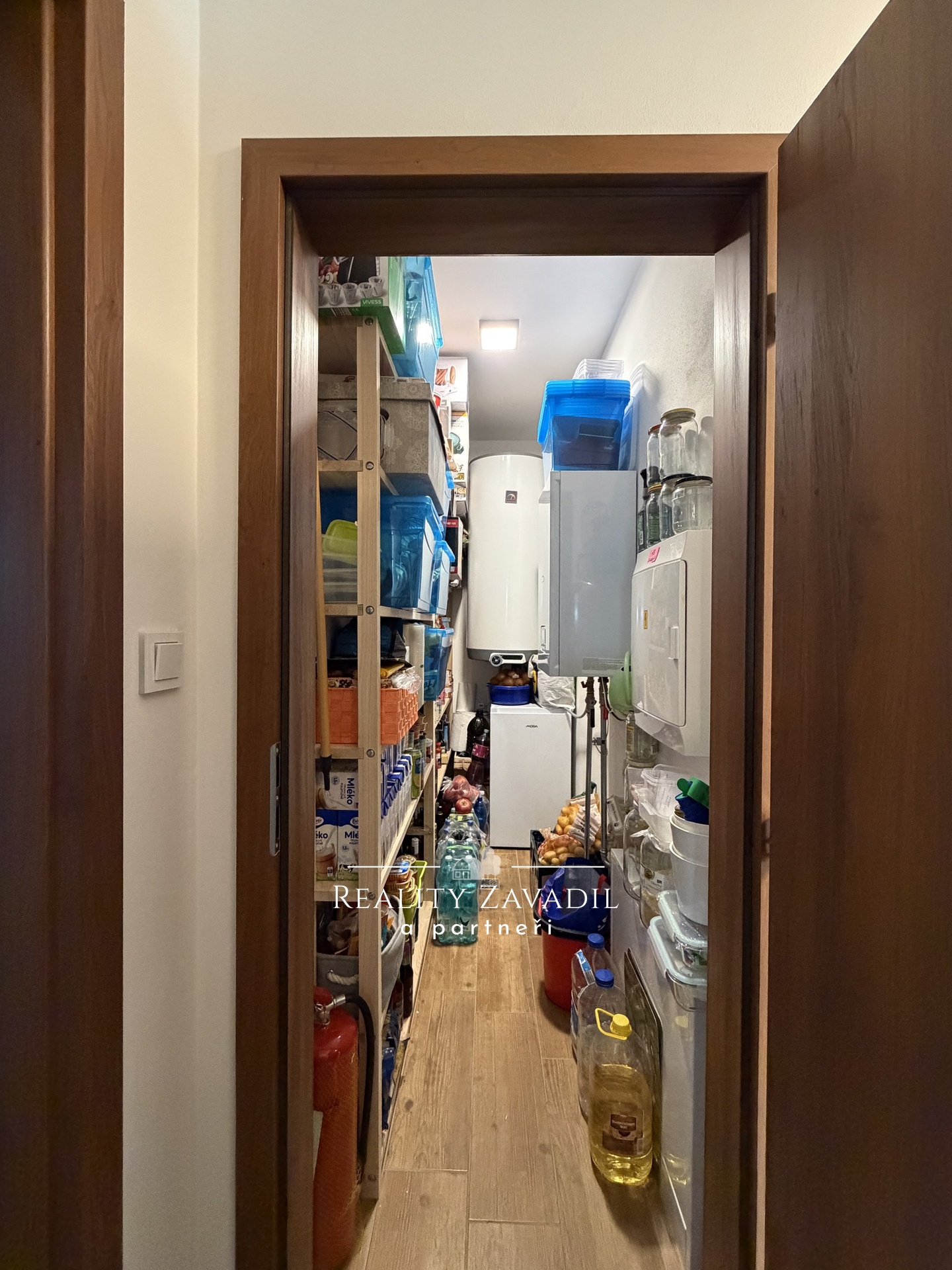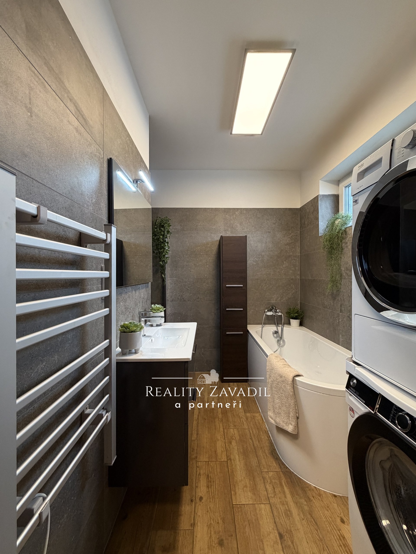 Po pravé straně chodby je prostorná koupelna s vanou, sprchovým koutem, umyvadlem a místem pro pračku se sušičkou. Následuje samostatné WC a technická místnost s elektrickým bojlerem, topnou soustavou a zázemím pro podlahové vytápění. Technická místnost nabízí také dostatek úložného prostoru, například na potraviny.