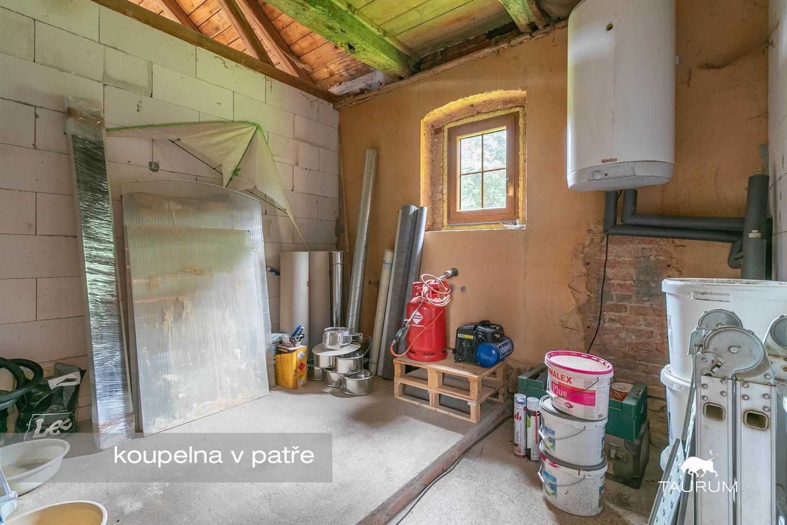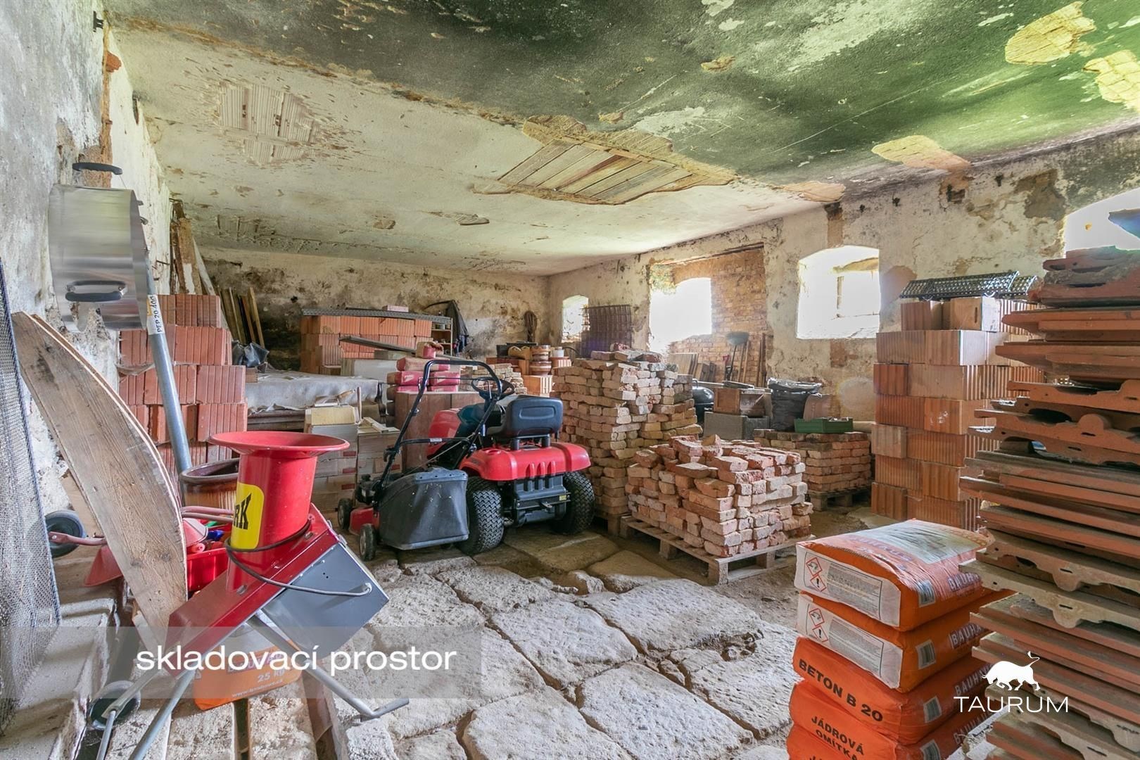 V domě je množství připraveného stavebního materiálu: trámy, cihly, broušené cihly, střešní tašky, kabeláž, polystyrenová izolace, vata, betonové překlady, tvárnice ytong, venkovní dlažba, prkna...