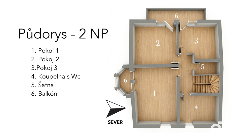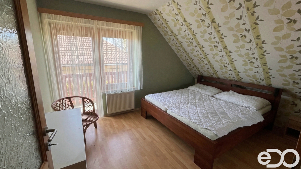 Podkroví: 3 prostorné ložnice (každá s vlastním balkonem), velká koupelna s WC a komora.
