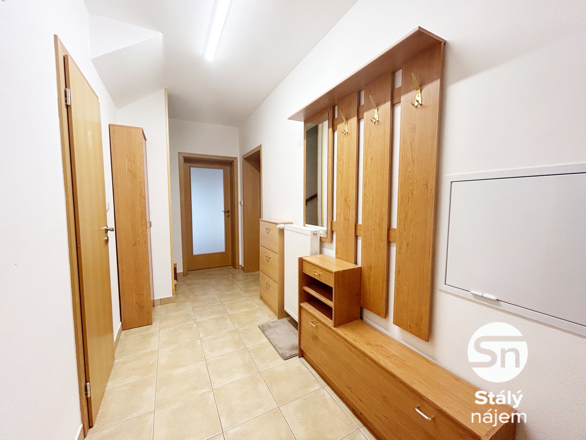 Nemovitost se podnajímá včetně vybavení a zařízení tak, jak je vidět na fotografiích. Interiér působí útulně a je prakticky řešen. Kuchyň je po dohodě možné vyměnit za novou je vybavena elektrickou troubou a elektrickým sporákem, příprava na myčku je k dispozici a myčku lze umístit vedle dřezu. Ohřev vody a vytápění zajišťuje plynový kotel, který je umístěn v samostatné technické místnosti v chodbě.
