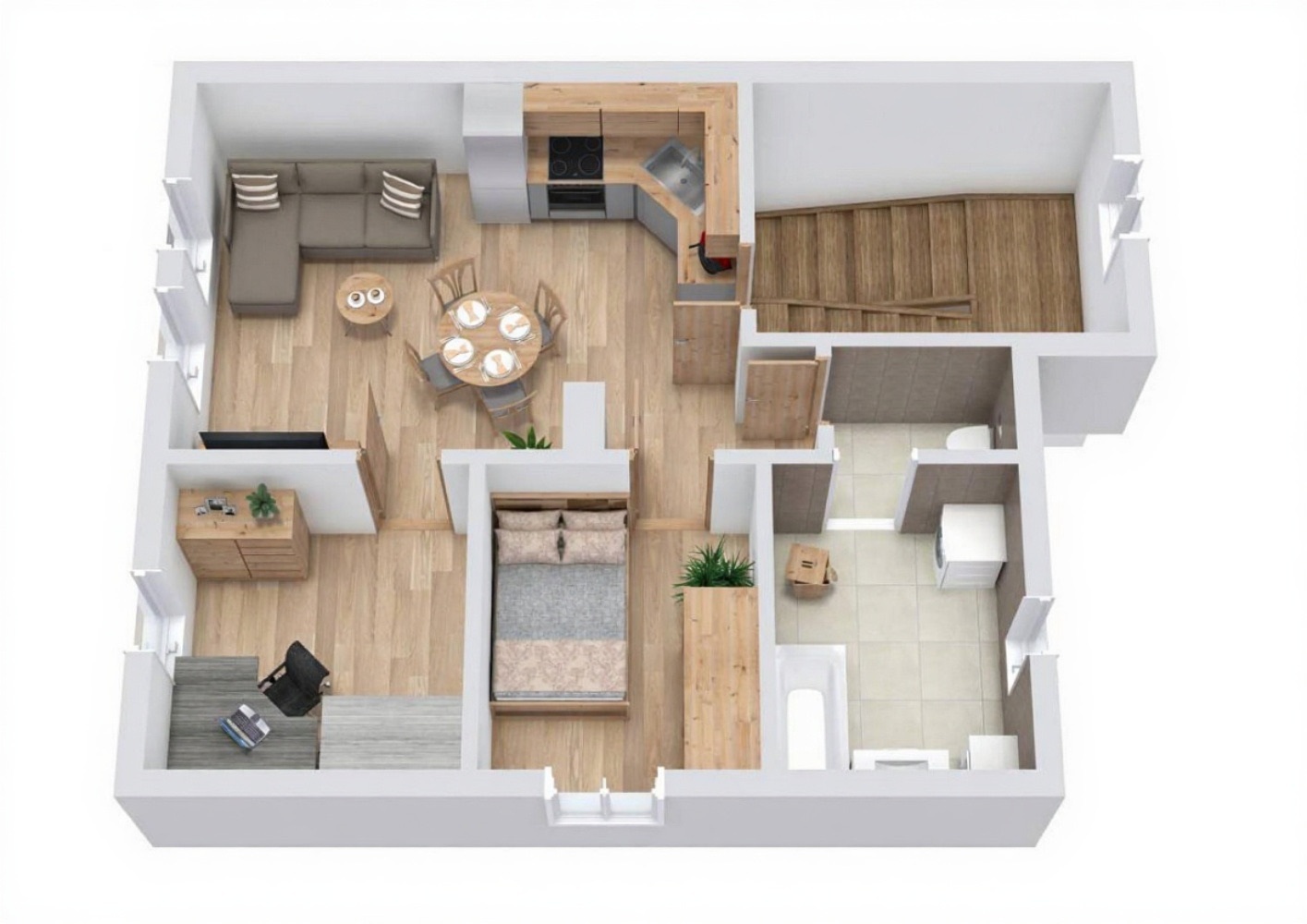 kuchyně, pokoj, koupelna s vanou a toaletou