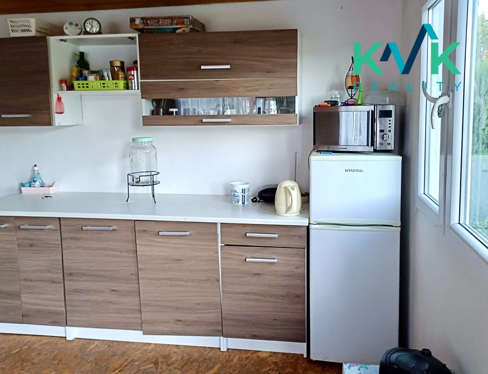 V přízemí se nachází kuchyňská linka, spaní je řešeno v podkroví. Součástí je komín připravený k instalaci kamen, což umožňuje vytápění a prodloužení sezóny užívání.