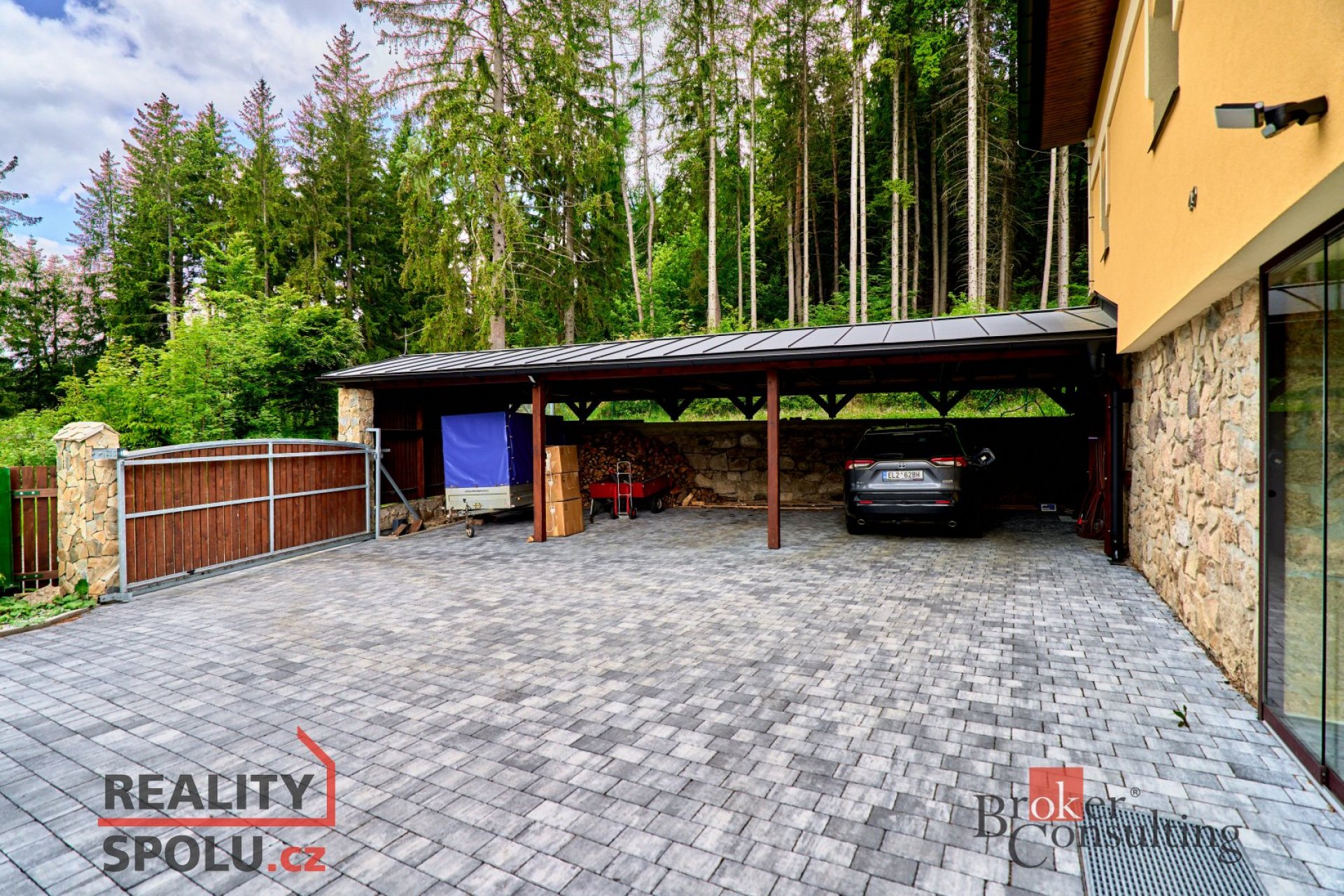 A pak pozemek. Přes 2200 m² volnosti. Dvůr střežený kamerovým systémem. Tři vjezdy, parkování pro šest aut, a ze stájí řehtání koní. A to ticho. Takové to opravdové, co už ve městech přestalo existovat. Tady příroda není kulisou, ale součástí každého dne.