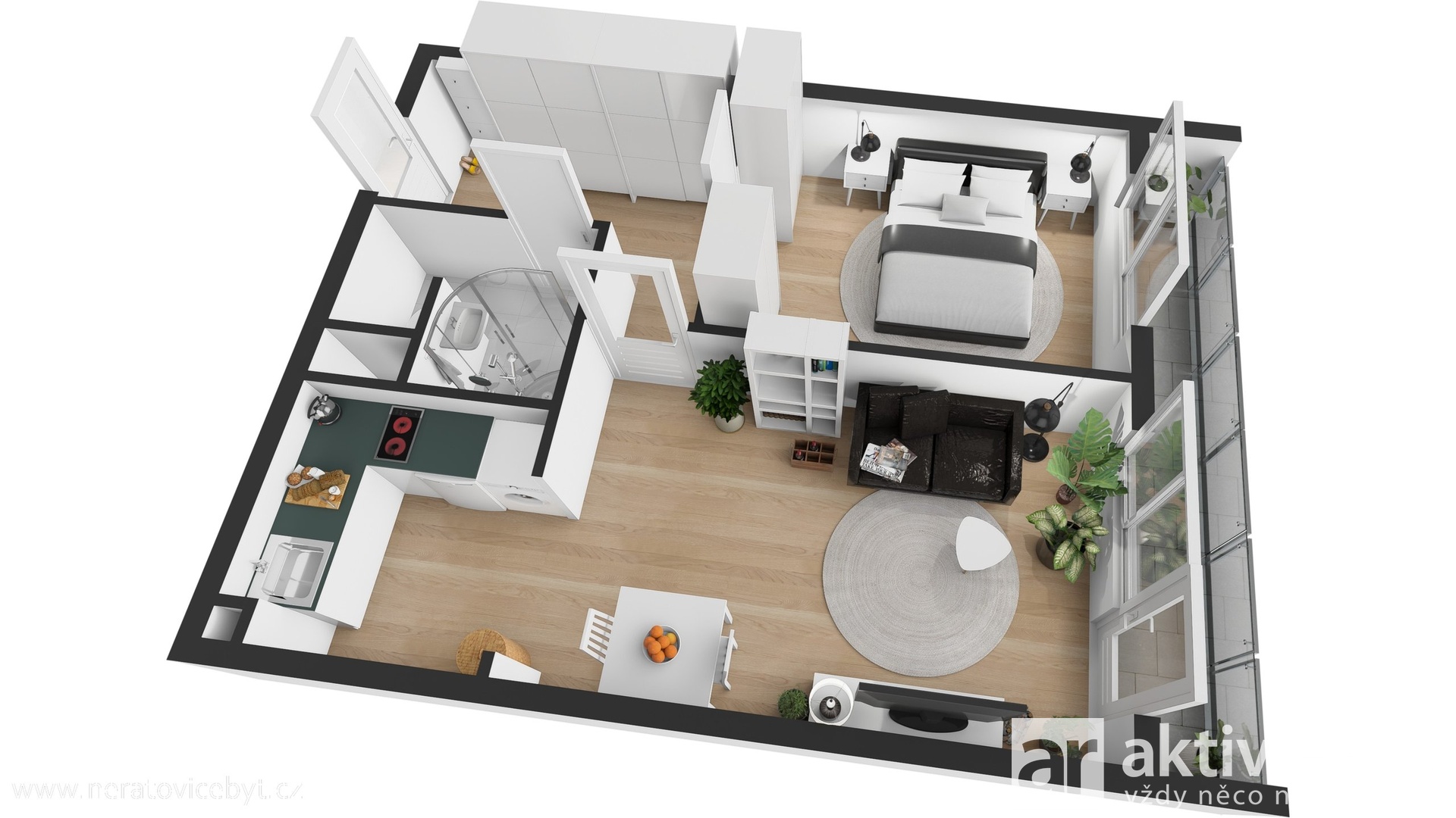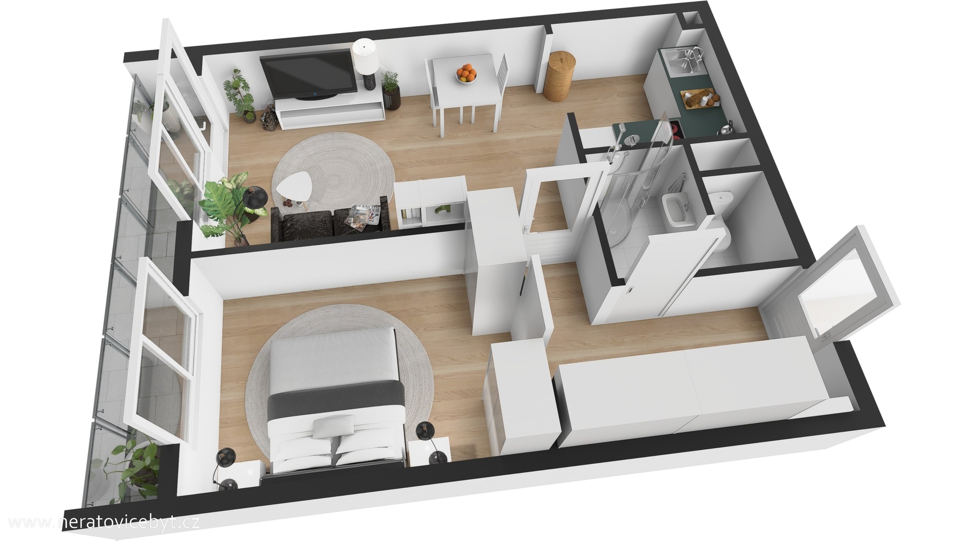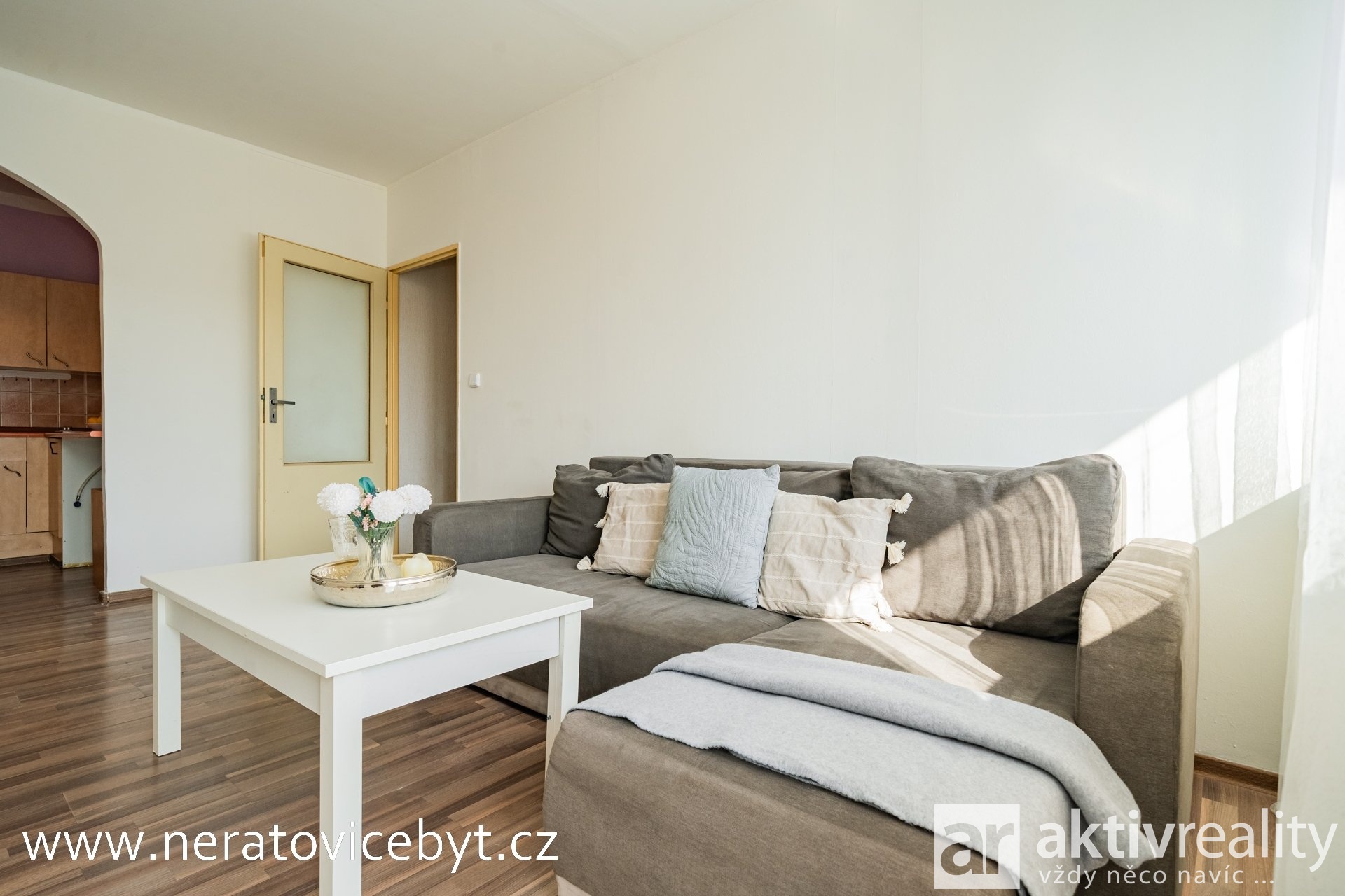 Po vstupu se nachází chodba s vestavěnou šatní skříní, která nabízí dostatek úložného prostoru. Z chodby je vstup do koupelny se sprchovým koutem a toaletou. Dále je zde samostatný pokoj s chytrým řešením vestavěné skříně, která zároveň slouží jako dveře do místnosti a šetří tak prostor. Hlavní obytnou část tvoří obývací pokoj se vstupem na lodžii, která příjemně rozšiřuje obytný prostor. Na obývací pokoj navazuje kuchyně. K bytu náleží také komora umístěná na chodbě domu a sklepní kóje.