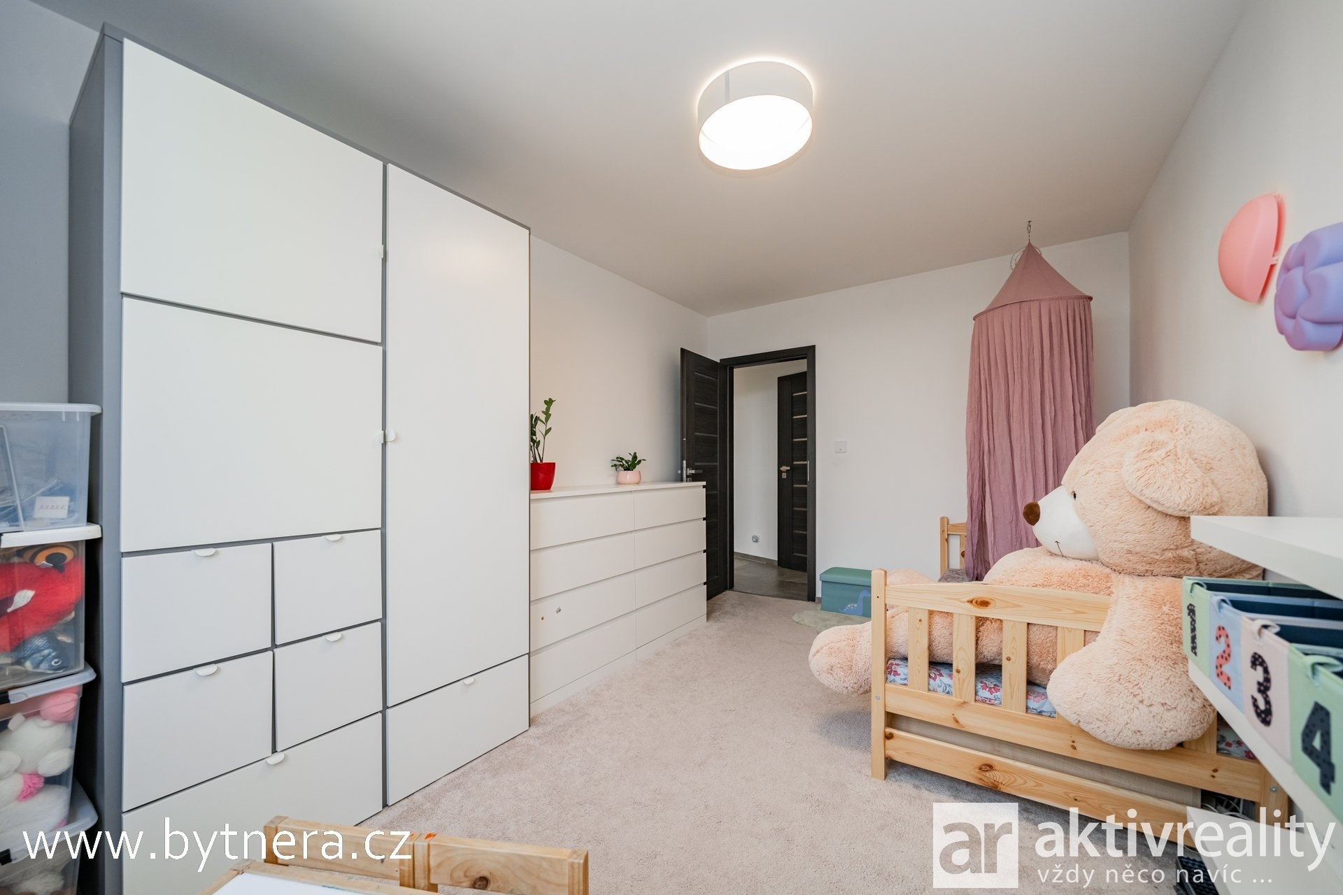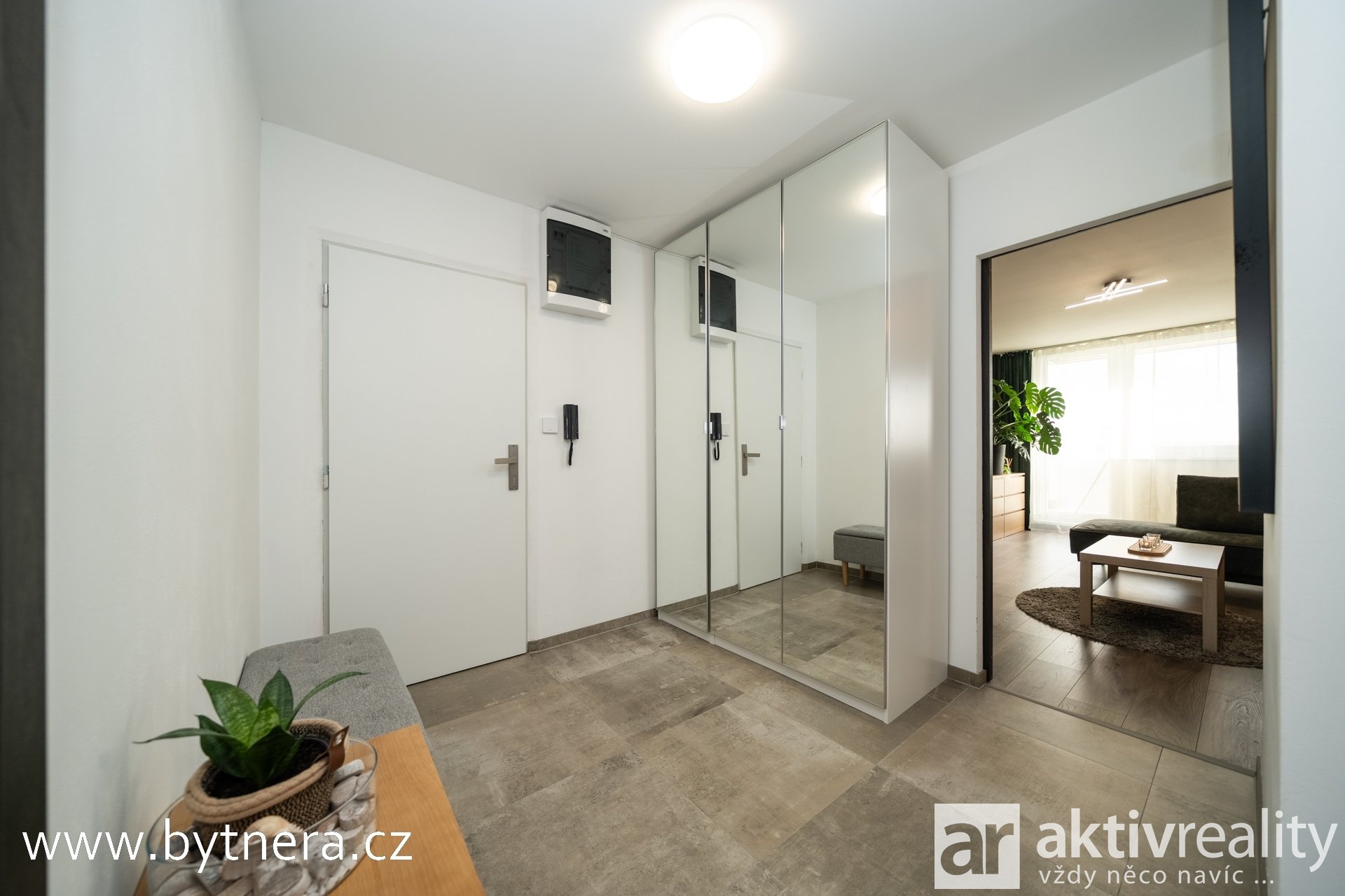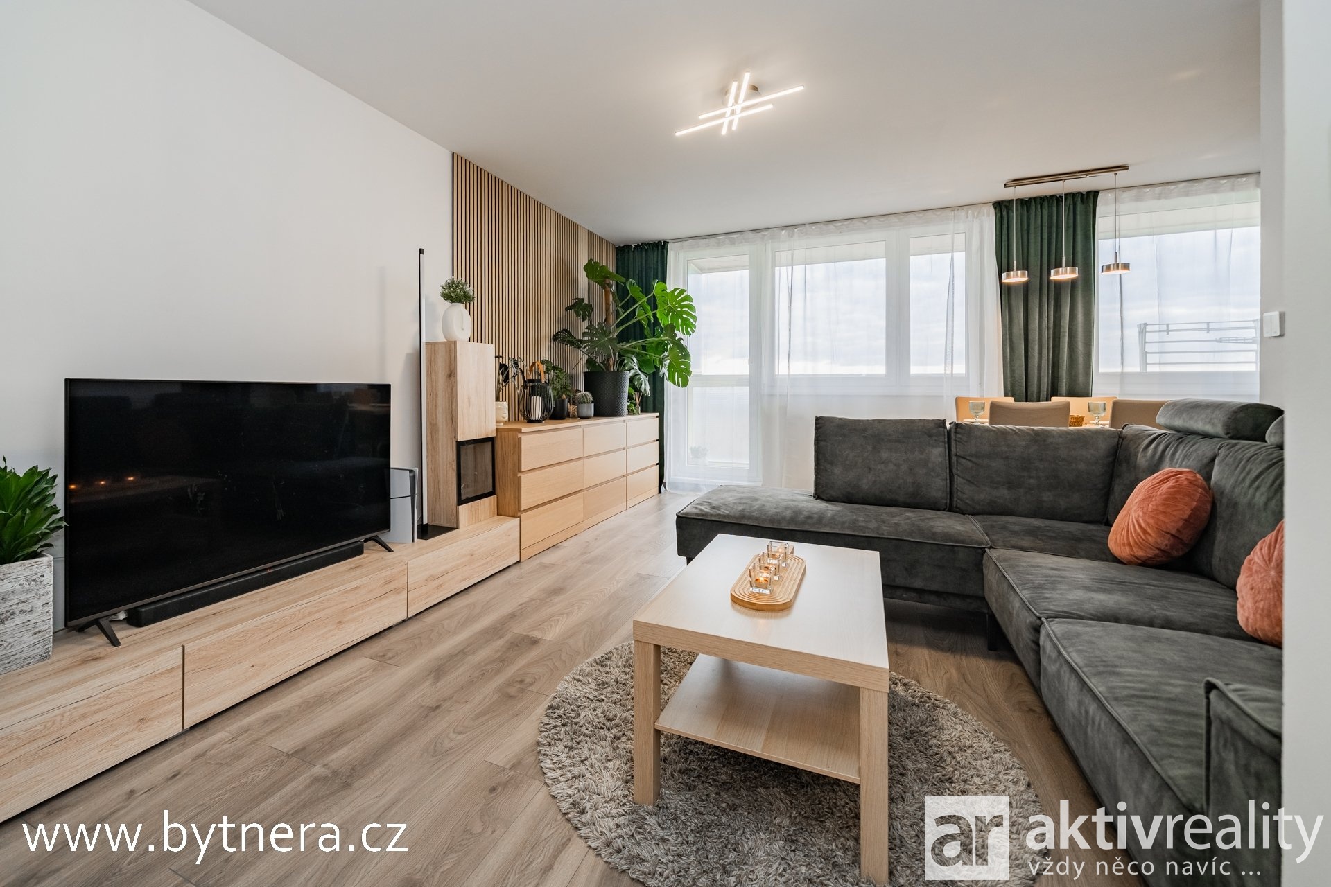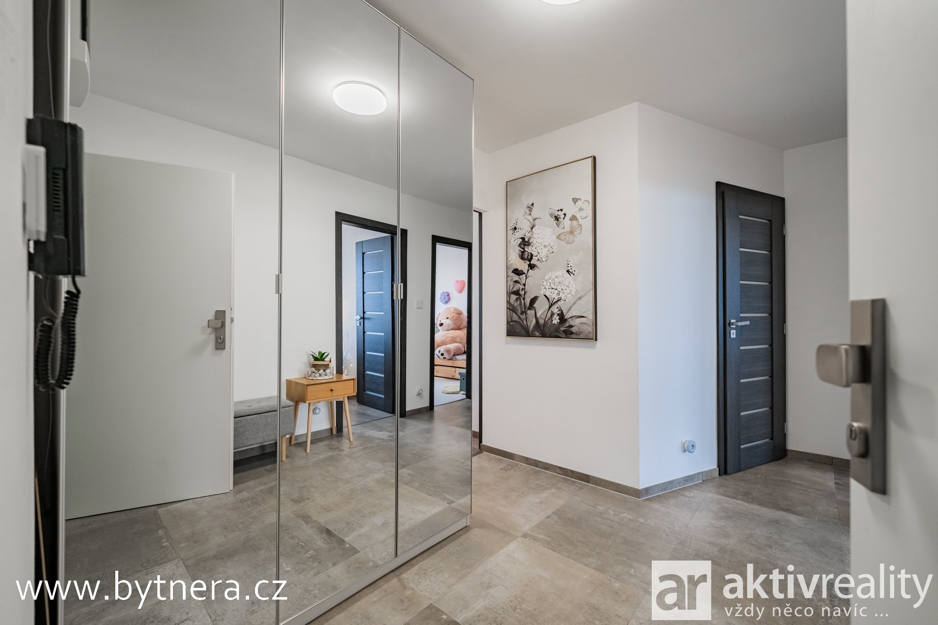 Disponuje světlým obývacím pokojem s jídelním koutem a vstupem na zasklenou lodžii. Kuchyně je vybavena novou moderní kuchyňskou linkou se zabudovanými spotřebiči a nabízí dvě praktické špajzy. K dispozici jsou dále dva samostatné pokoje – ložnice a dětský pokoj – s příjemným výhledem do okolí. Prostorná moderní koupelna je vybavena vanou a přípojkou na pračku, přičemž zde zůstal dostatek místa i pro sušičku.