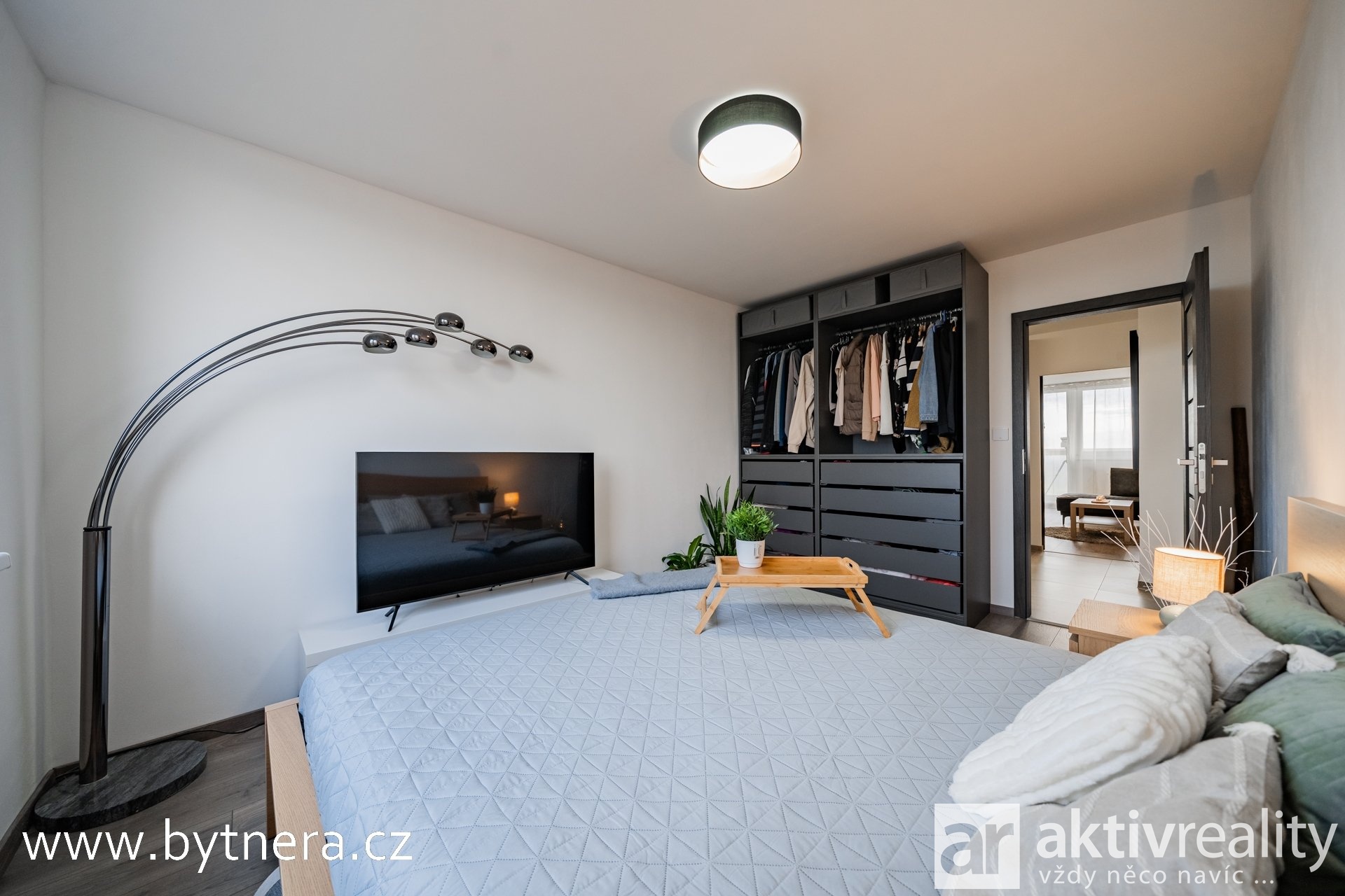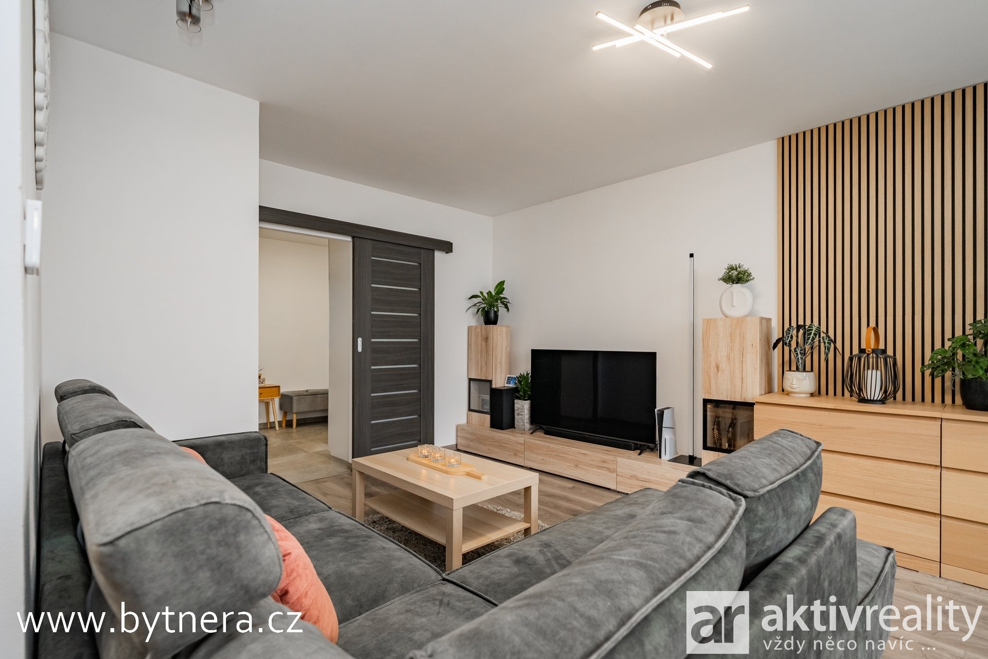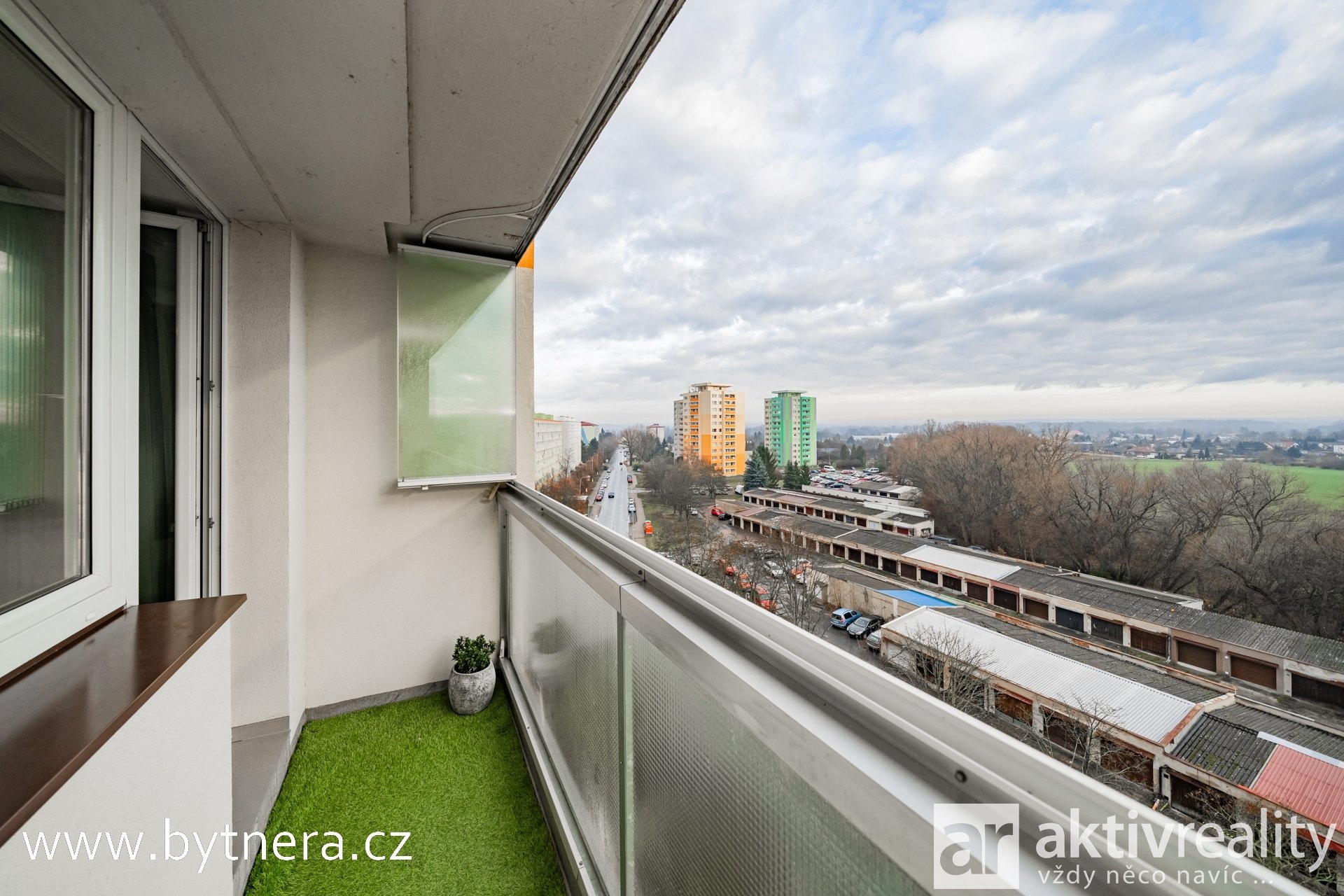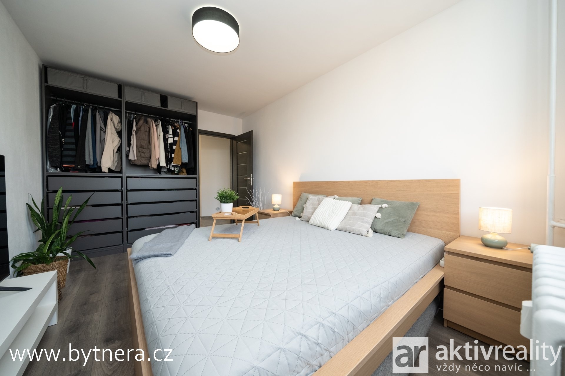 Disponuje světlým obývacím pokojem s jídelním koutem a vstupem na zasklenou lodžii. Kuchyně je vybavena novou moderní kuchyňskou linkou se zabudovanými spotřebiči a nabízí dvě praktické špajzy. K dispozici jsou dále dva samostatné pokoje – ložnice a dětský pokoj – s příjemným výhledem do okolí. Prostorná moderní koupelna je vybavena vanou a přípojkou na pračku, přičemž zde zůstal dostatek místa i pro sušičku.