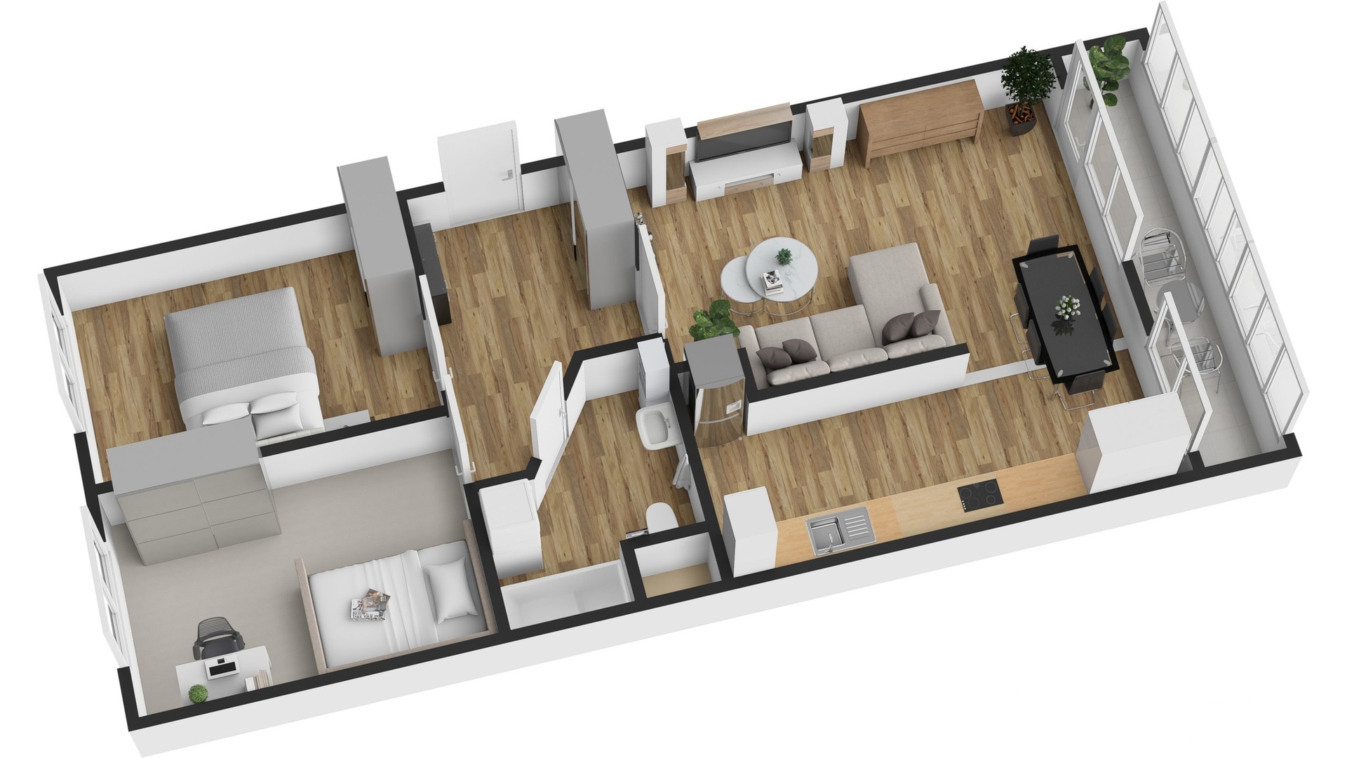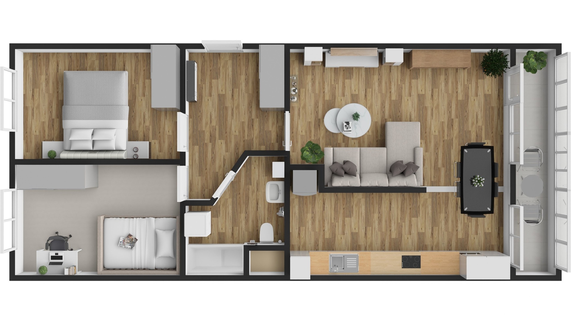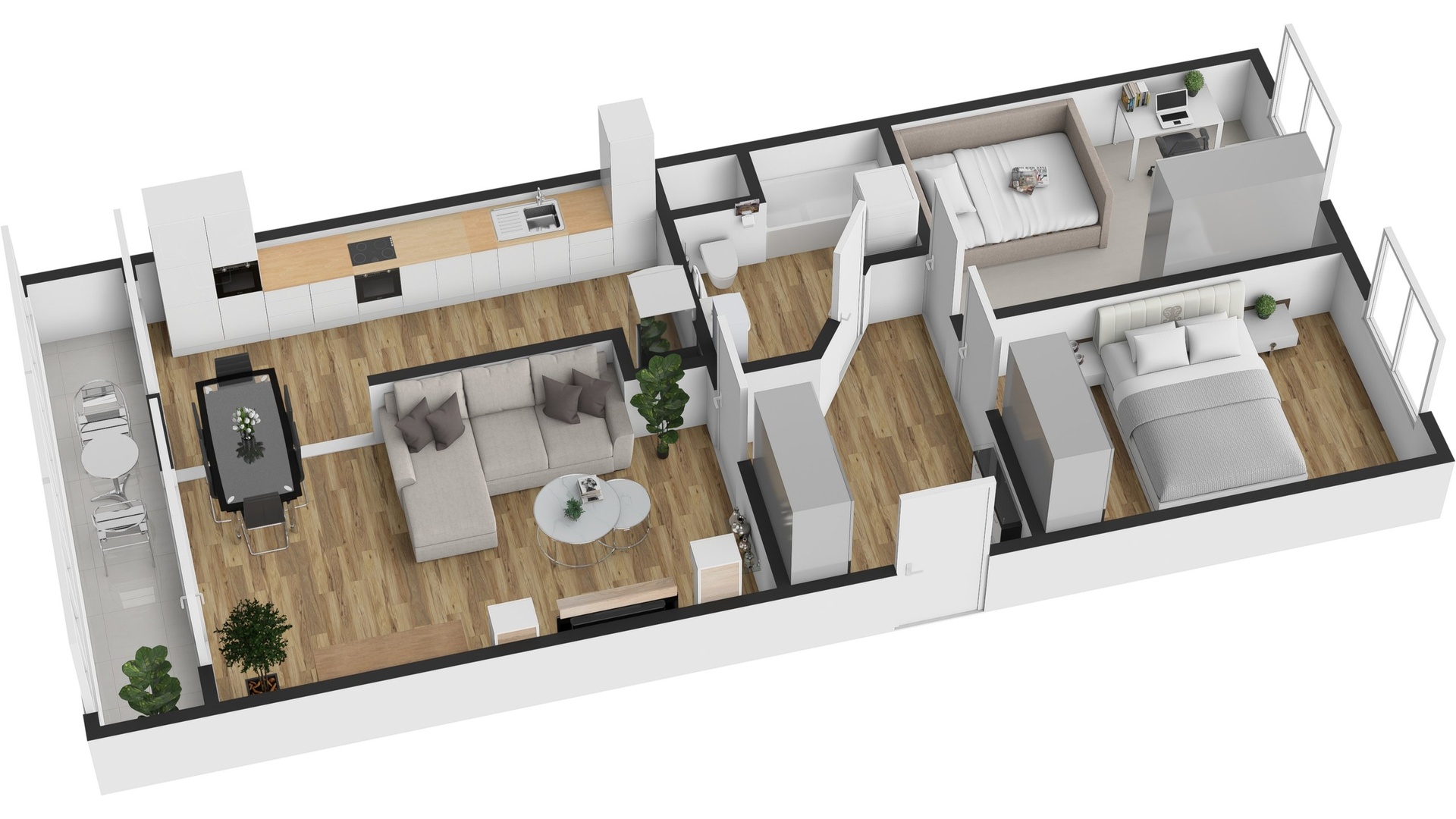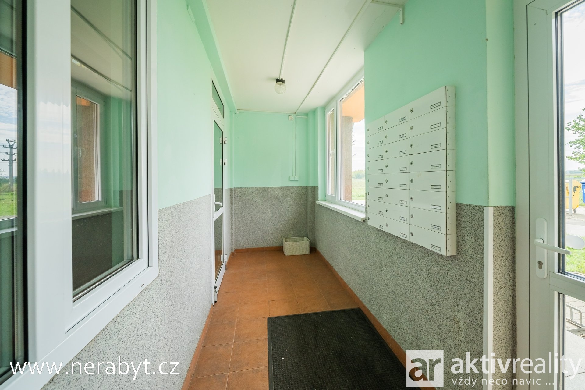 Disponuje světlým obývacím pokojem s jídelním koutem a vstupem na zasklenou lodžii. Kuchyně je vybavena novou moderní kuchyňskou linkou se zabudovanými spotřebiči a nabízí dvě praktické špajzy. K dispozici jsou dále dva samostatné pokoje – ložnice a dětský pokoj – s příjemným výhledem do okolí. Prostorná moderní koupelna je vybavena vanou a přípojkou na pračku, přičemž zde zůstal dostatek místa i pro sušičku.