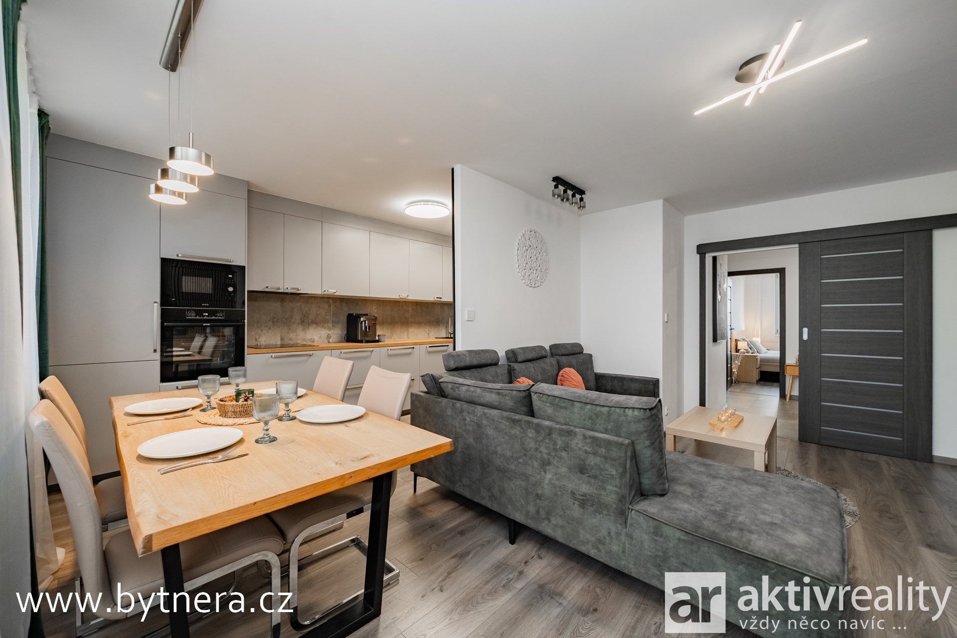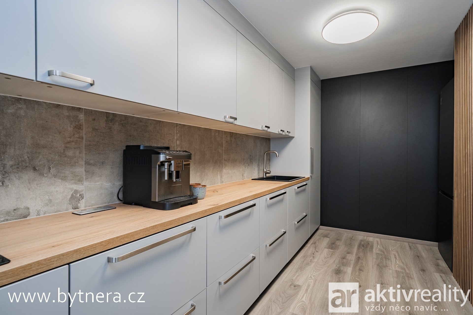 Byt prošel kompletní rekonstrukcí – elektřina je v mědi, byt má zděné jádro, snížené sádrokartonové stropní podhledy a akustické panely, které zvyšují komfort bydlení a útulnost interiéru. Osvětlení je moderně řešeno s možností ovládání přes mobilní aplikaci. V bytě také byly použity akustické panely, které celému prostoru dodávají útulnost.