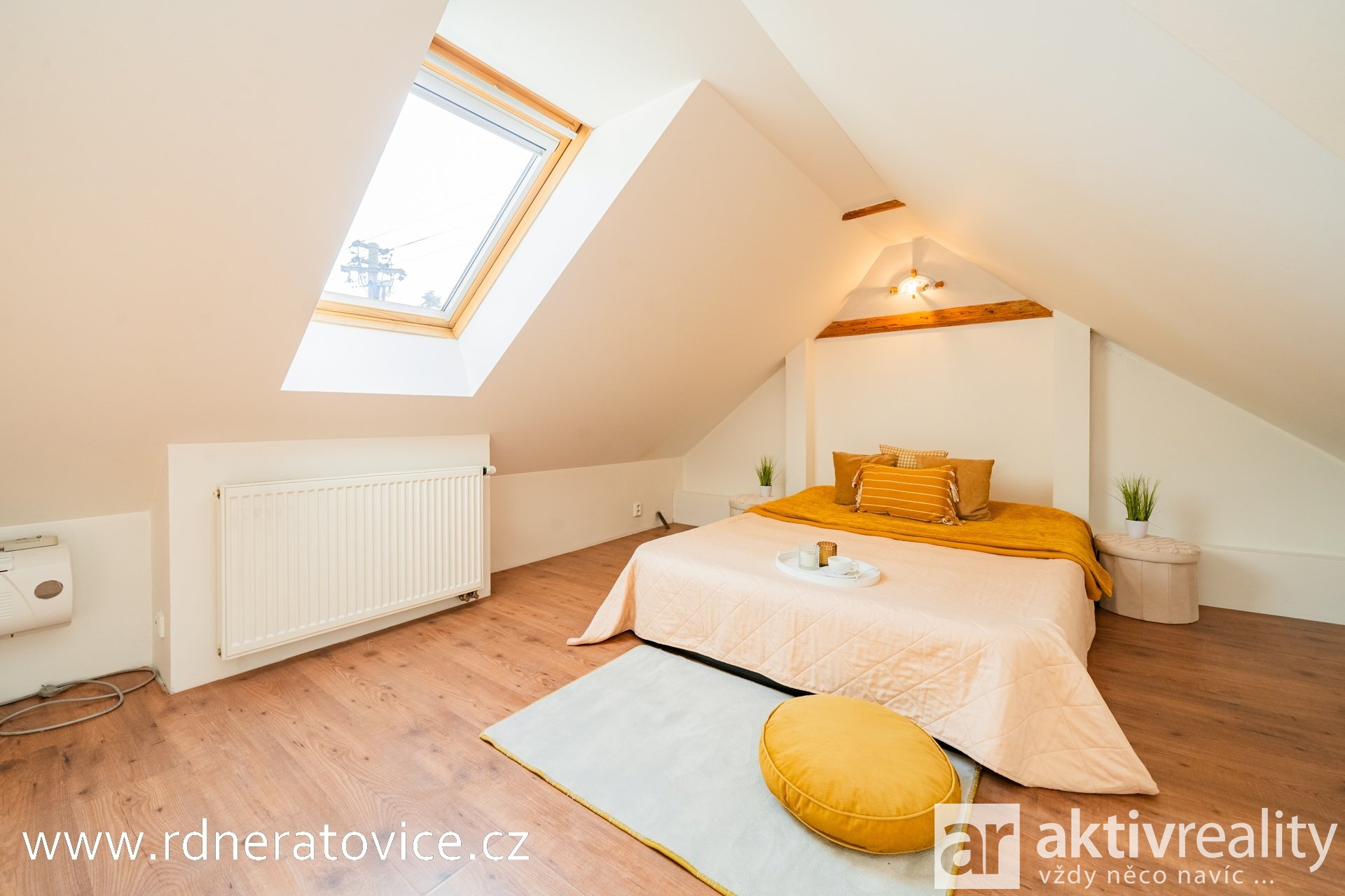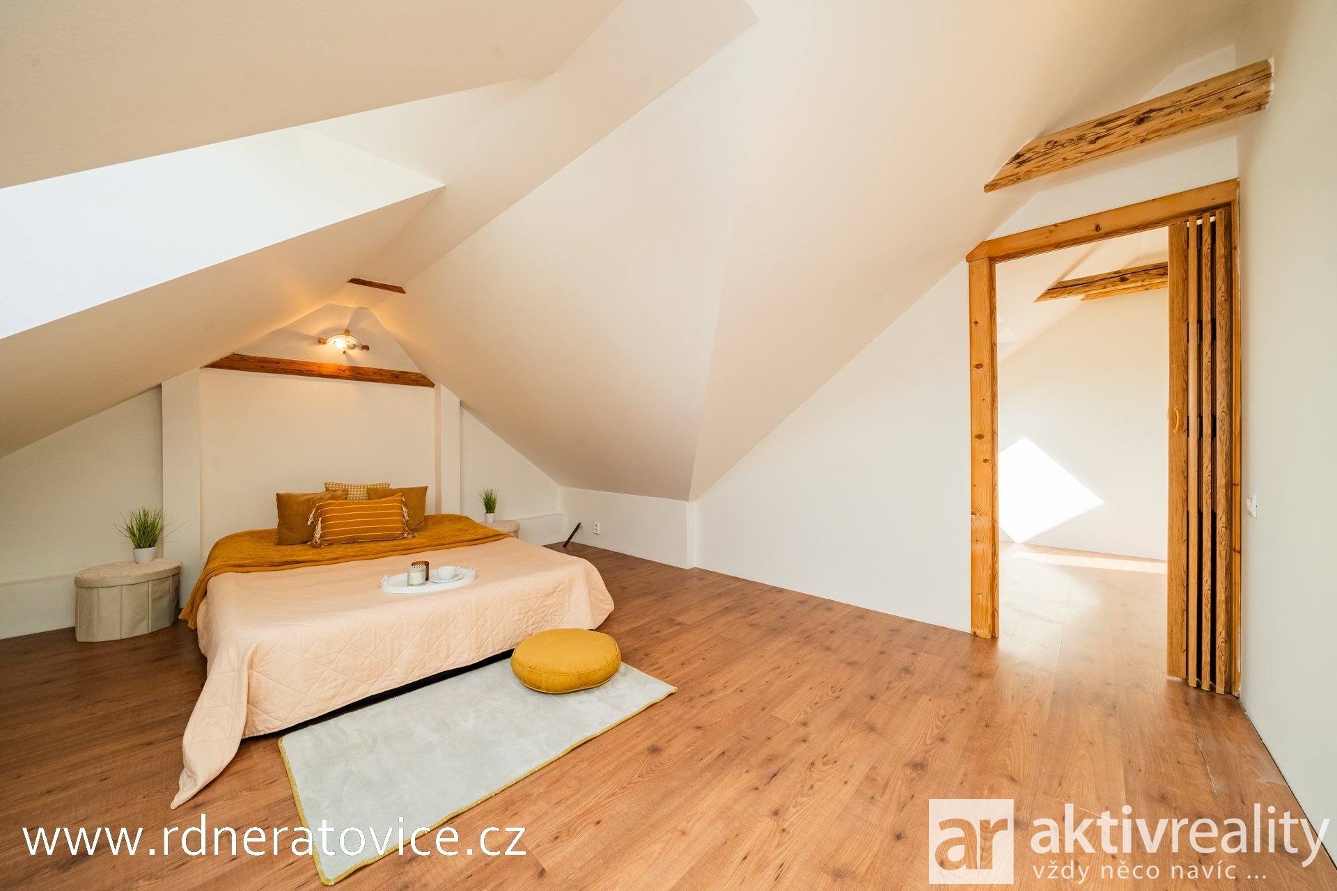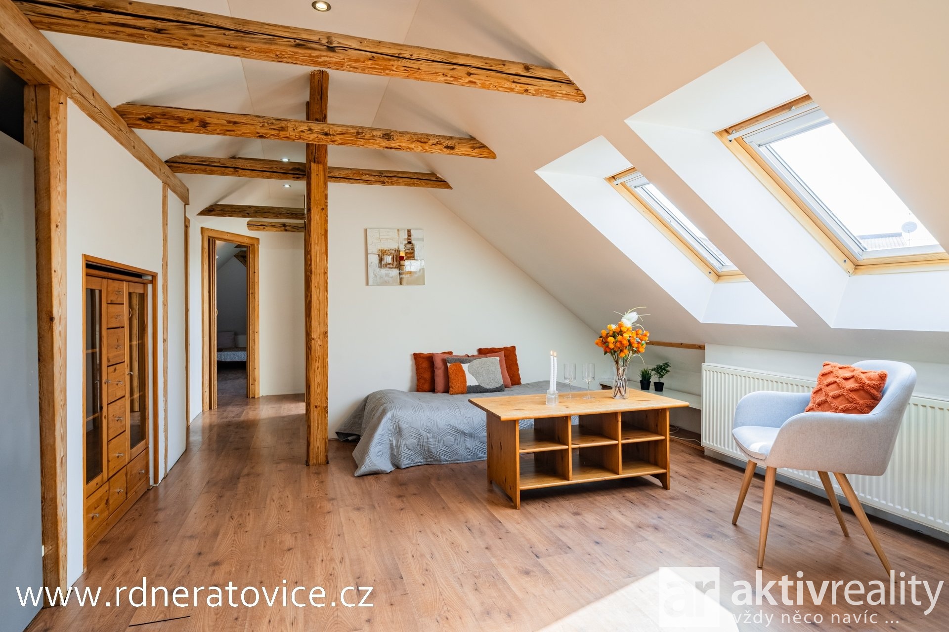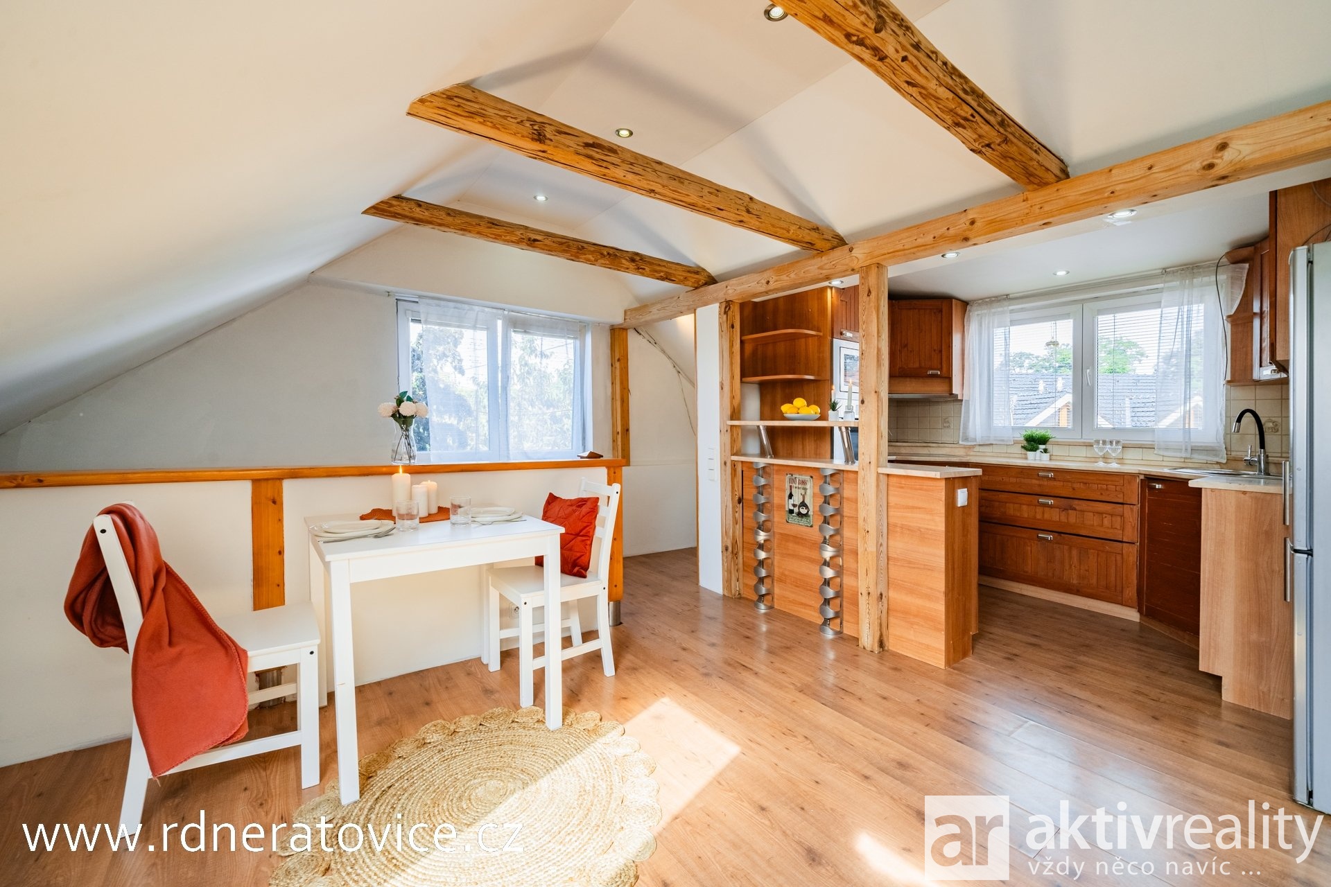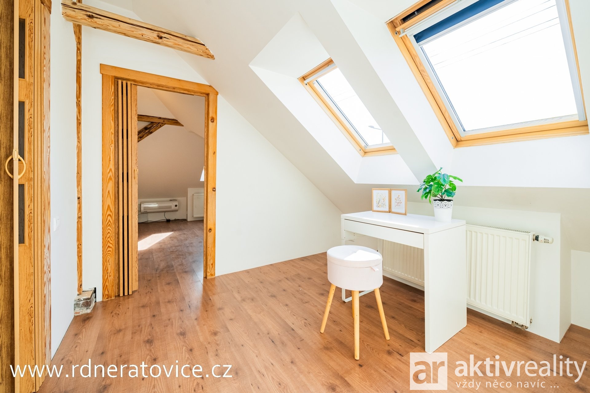 Do podkroví vejdete přes vstupní chodbu po schodišti s dřevěnými stupnicemi. Dispozice nabízí obývací pokoj s jídelnou a kuchyní na míru (myčka Bosch, sklokeramická deska Fagor), ložnici, dětský pokoj, pracovnu, technickou místnost a koupelnu s vanou, WC, přípojkou na pračku a vstupem na balkon. Byt má vlastní měřiče vody, elektřiny i plynu. Vytápění a ohřev vody zajišťuje plynový kotel.