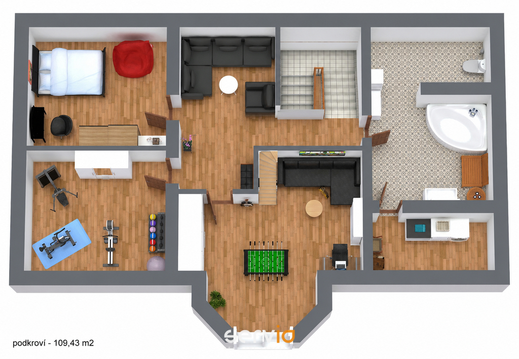 2.NP - 109,43 m2 (podkroví s vysokým úkosem, který nepřekáží užívání prostor) - 3 pokoje (z nichž jeden je 2 patrový - mezonetový), prostorná centrální hala využívaná jako druhý obývací pokoj (zde je možnost připojení druhé kuchyně), koupelna s WC, komora, terasa (6,47 m2).