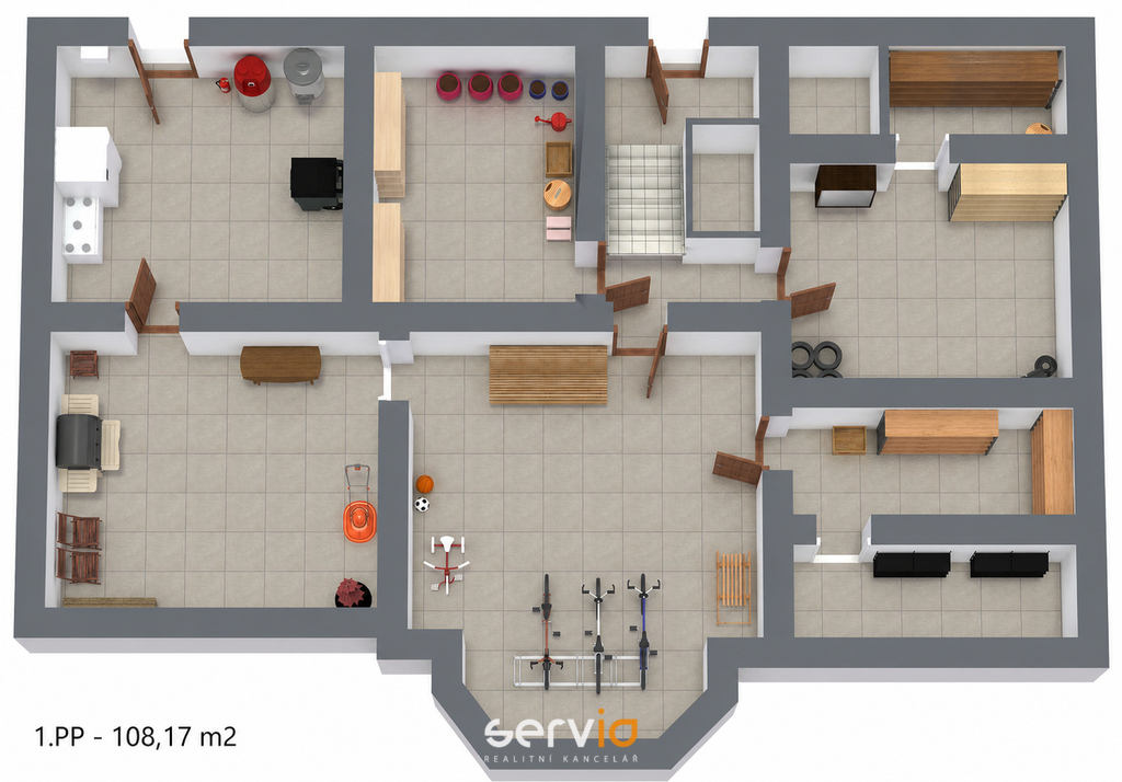 1.PP - 108,17 m2 - 7 skladových/sklepních prostor, technická místnost, chodba