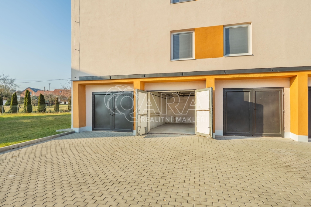 Společně s bytem je také možnost dokoupit za 400.000,- Kč zděnou, uzavíratelnou garáž o velikosti 20 m² umístěnou v přízemí domu (není ale podmínkou), jinak lze parkovat bez problému na ulici.