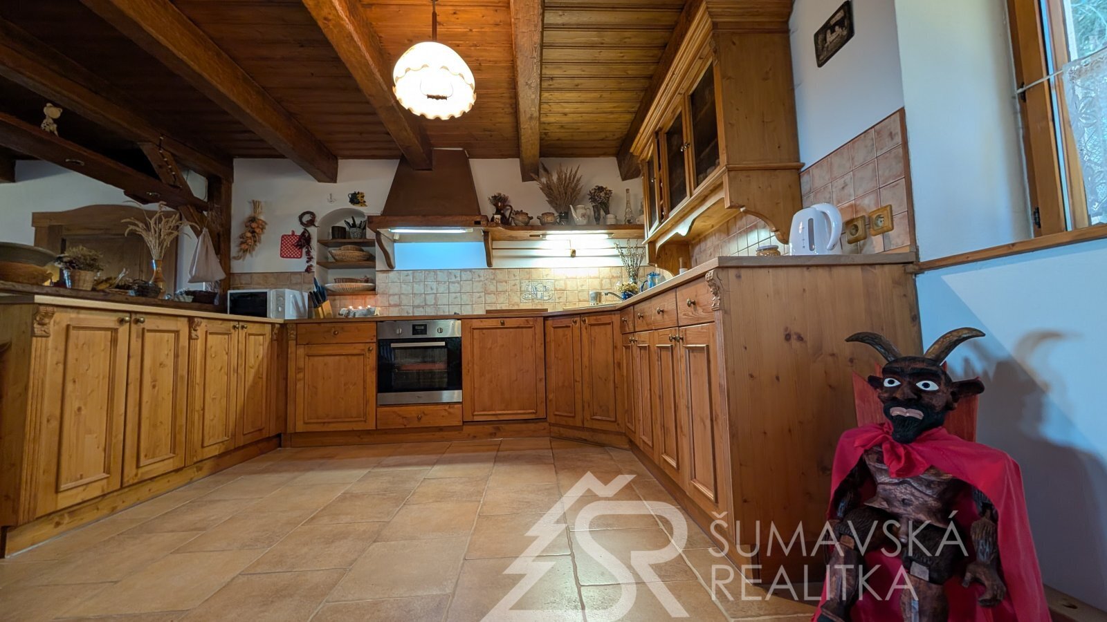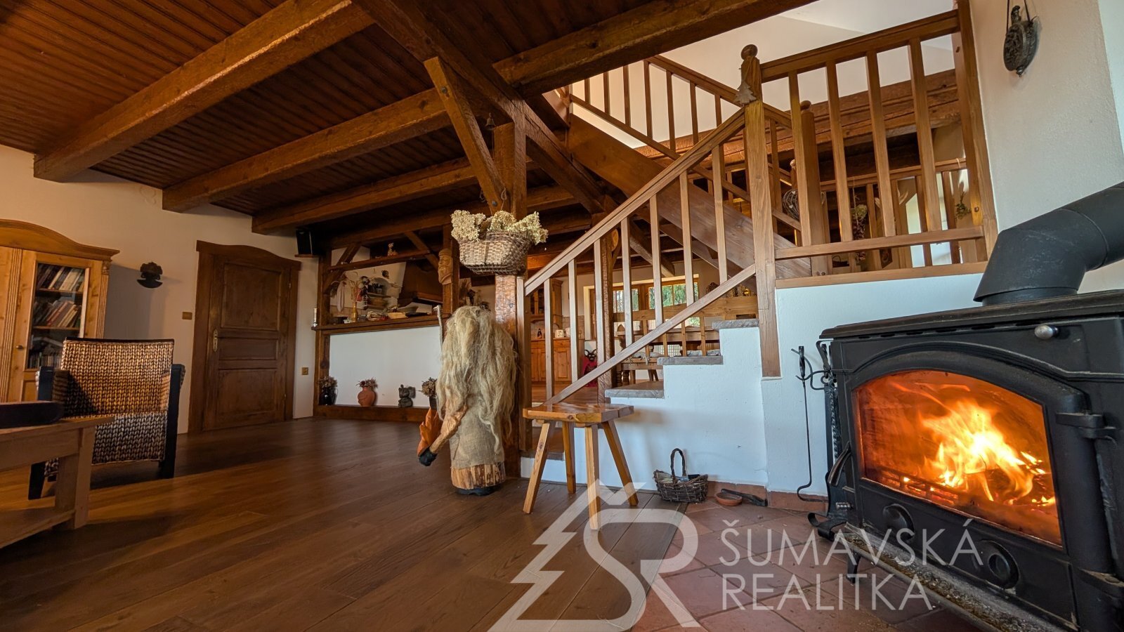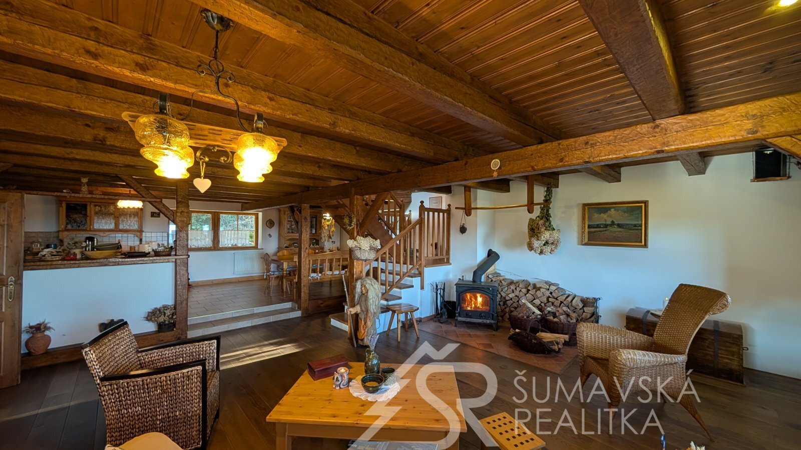 Popis domu: samostatně stojící dům, jednopodlažní, nepodsklepený s obytným podkrovím. Střecha sedlová krytá betonovou taškou Bramac. Velice příjemná je krytá jihovýchodní terasa s dechberoucím výhledem. V přízemí se ze zádveří vstupuje do spodní koupelny, samostatného WC a samozřejmě do obývajícího pokoje spojeného s kuchyní a jídelnou (71 m2). Po dřevěném schodišti vystoupáme do patra, kde se nachází tři samostatné ložnice, druhá koupelna, šatna a krytý balkon. Technická místnost s kotlem, bojlerem a pračkou je v přízemí. Vedle domu je ještě samostatná kolna/dílna. Okna jsou dřevěná, krytá okenicemi.