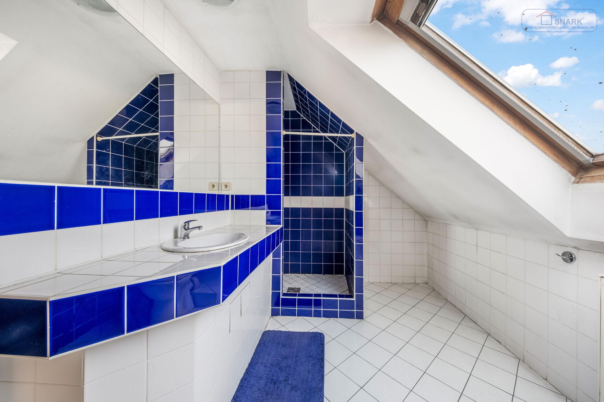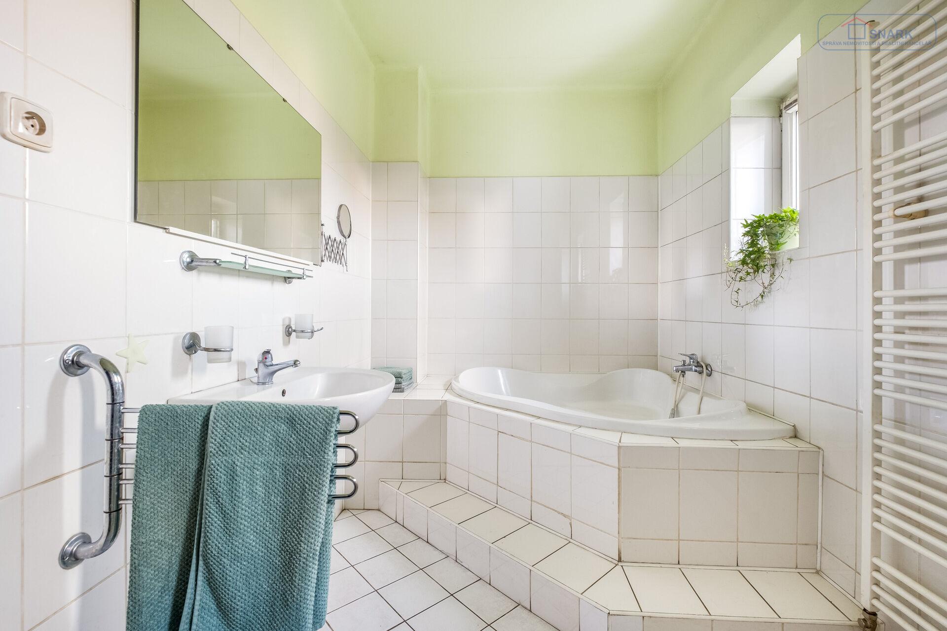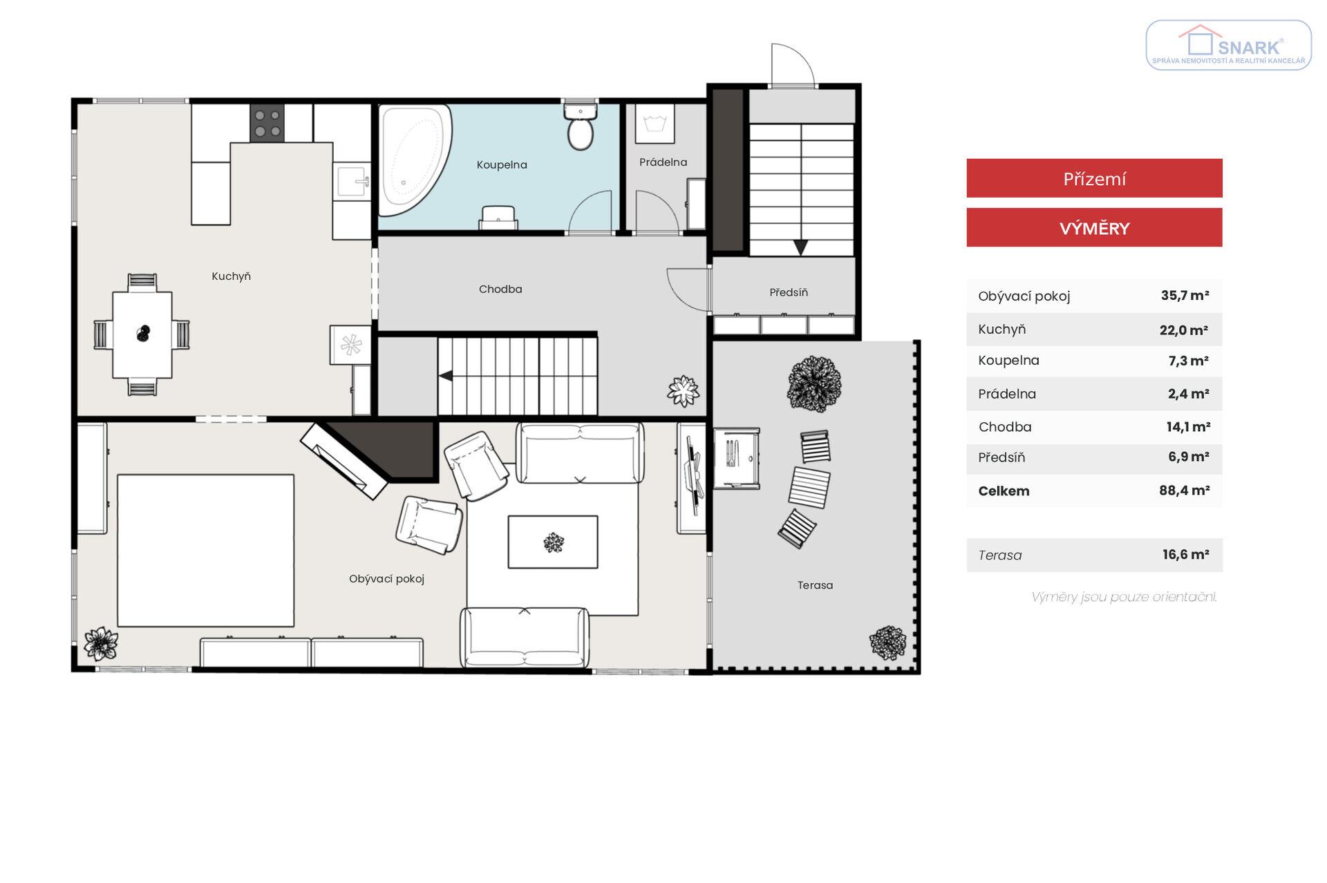 Patrový dům prošel v r. 2015 rekonstrukcí. Díky velkým oknům je interiér příjemně prosvětlený. Okna zároveň přirozeně propojují obytný prostor s rovinatou zahradou, kde se nachází bazén, prostorná terasa s výhledem na zámek a okolní krajinu, venkovní posezení s krbem a kryté parkovací stání pro dvě auta. Detailní dispozice domu je k dispozici v přiloženém půdorysu.