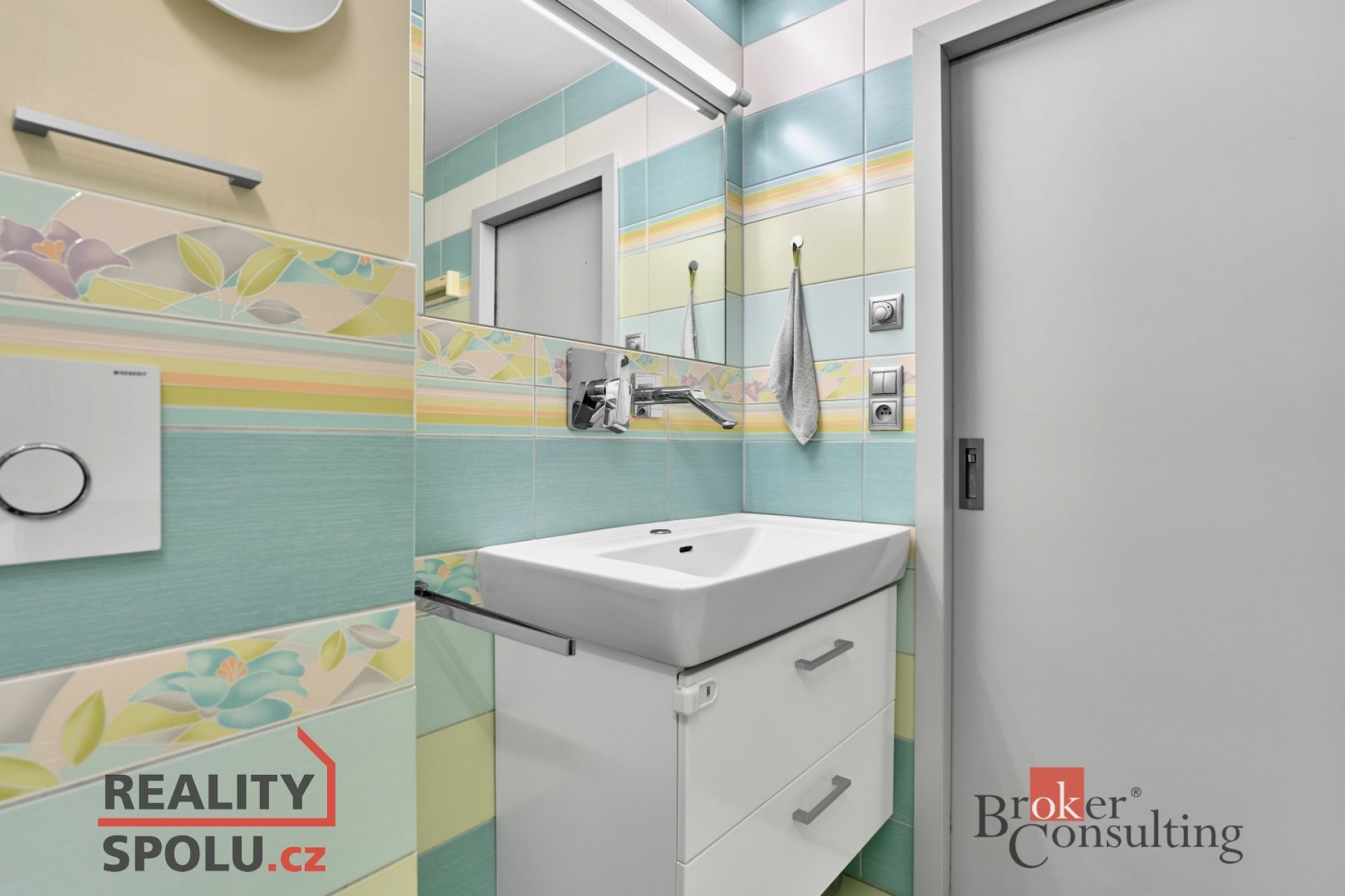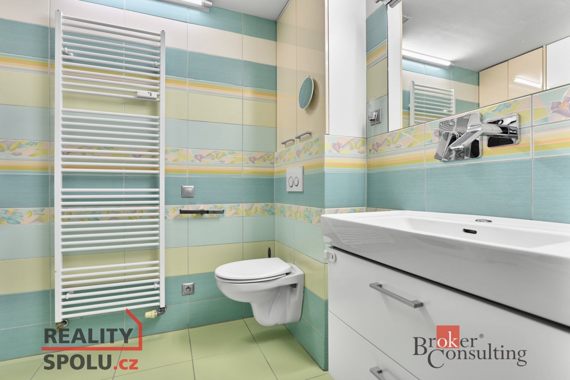 Koupelna je vybavena podlahovým vytápěním, topným žebříkem, vanou se zástěnou, velkým umyvadlem, toaletou, dále prostorem pro pračku a sušičku. Výhodou je další samostatná toaleta vedle koupelny. Podlahové vytápění je také v chodbě. Z chodby je přístup po menším schodišti do podkrovního prostoru se sníženým stropem, který sloužil jako hernička, nyní jako praktický úložný prostor (není ve fotogalerii zaznamenán). Ve schodišti se nachází další vestavěná skříň.