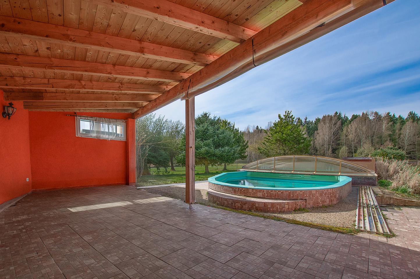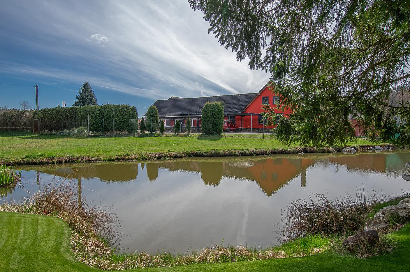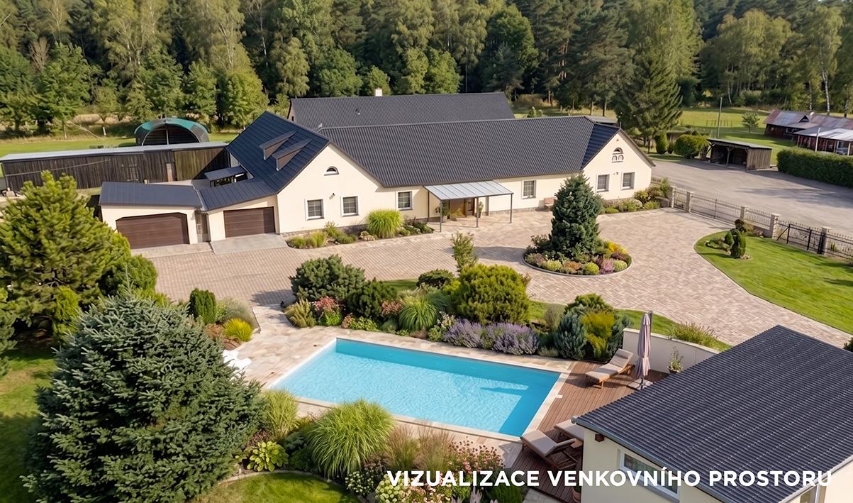 Součástí pozemku je krytý bazén, okrasné jezírko a rozsáhlé travnaté plochy vhodné pro chov koní či další aktivity. K dispozici je také dostatek parkovacích míst přímo v areálu.