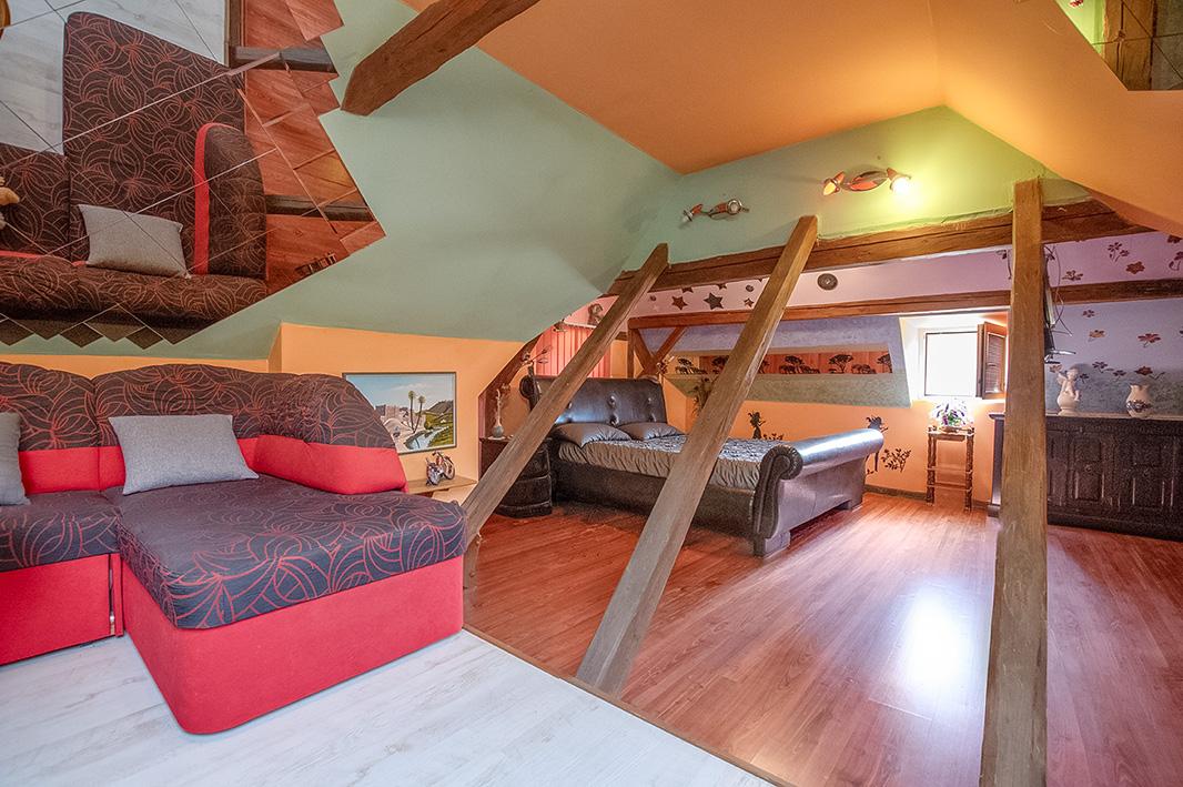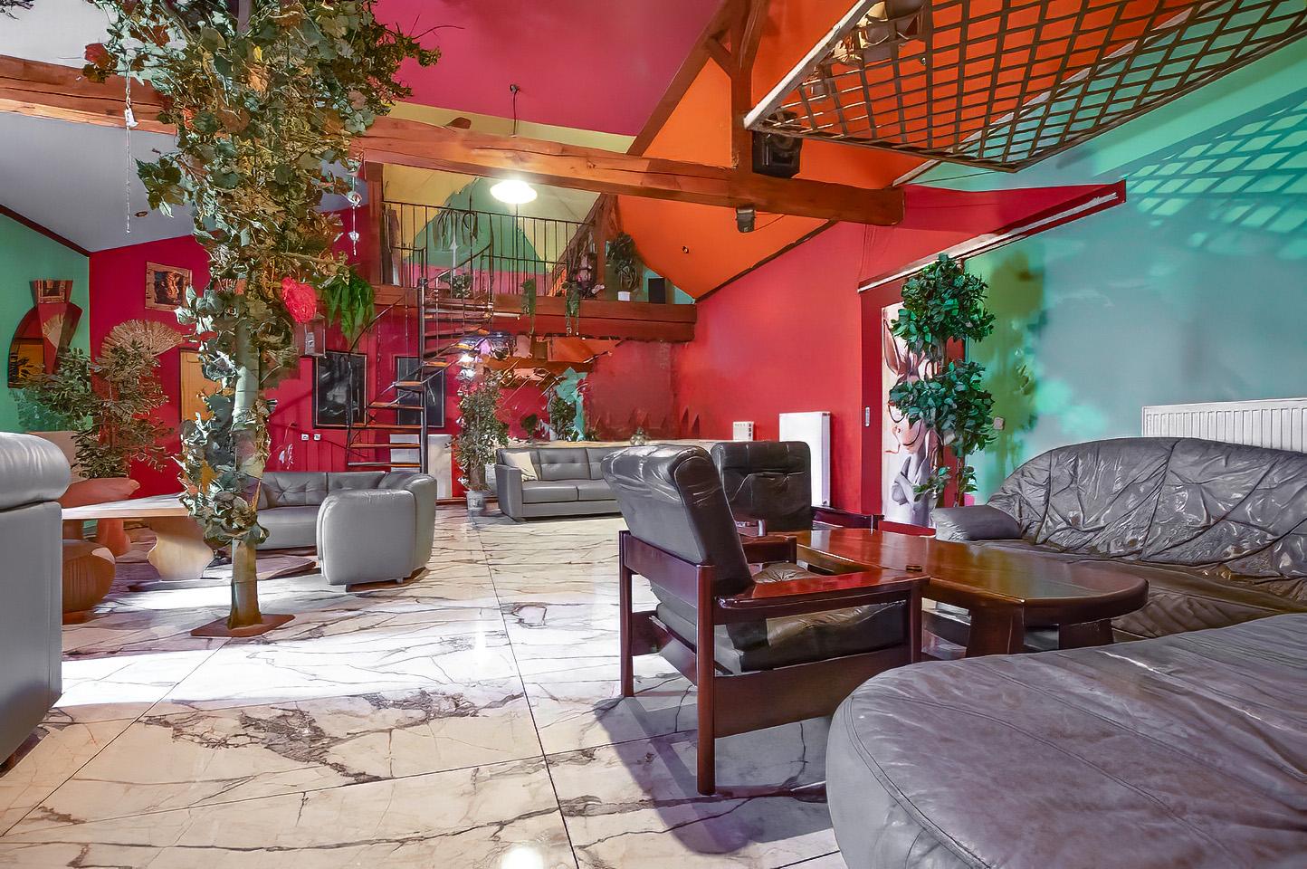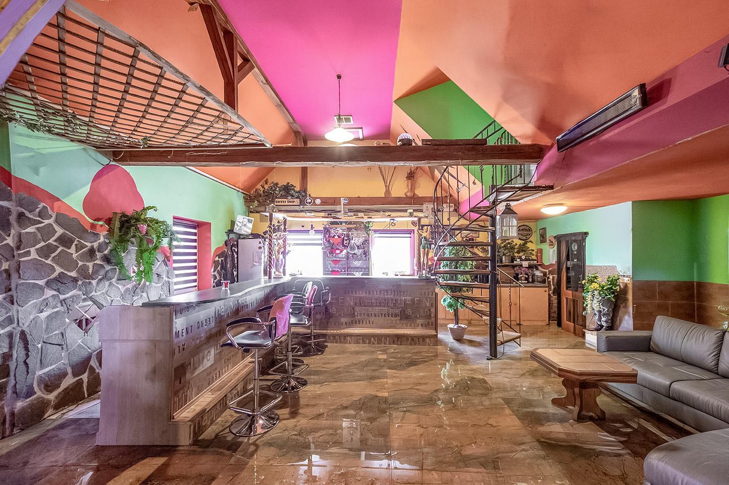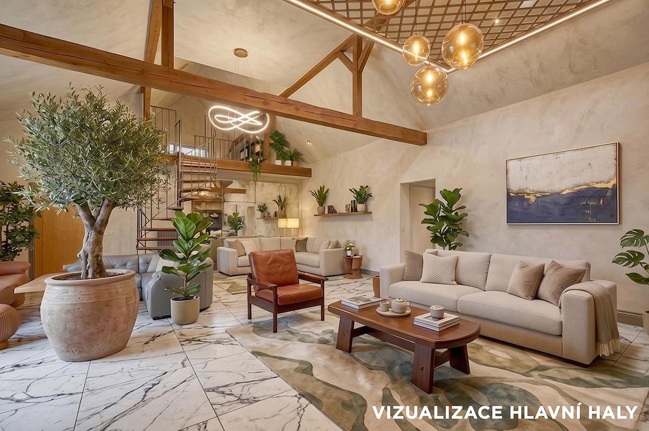 Dominantou objektu je velkorysý společenský prostor s barem, který lze využít pro soukromé akce, firemní setkání, retreaty nebo jako zázemí pro ubytovací či rekreační projekt. Na tento prostor navazuje obytná část a jednotlivé apartmány, které nabízejí potenciál pro krátkodobé i dlouhodobé ubytování.