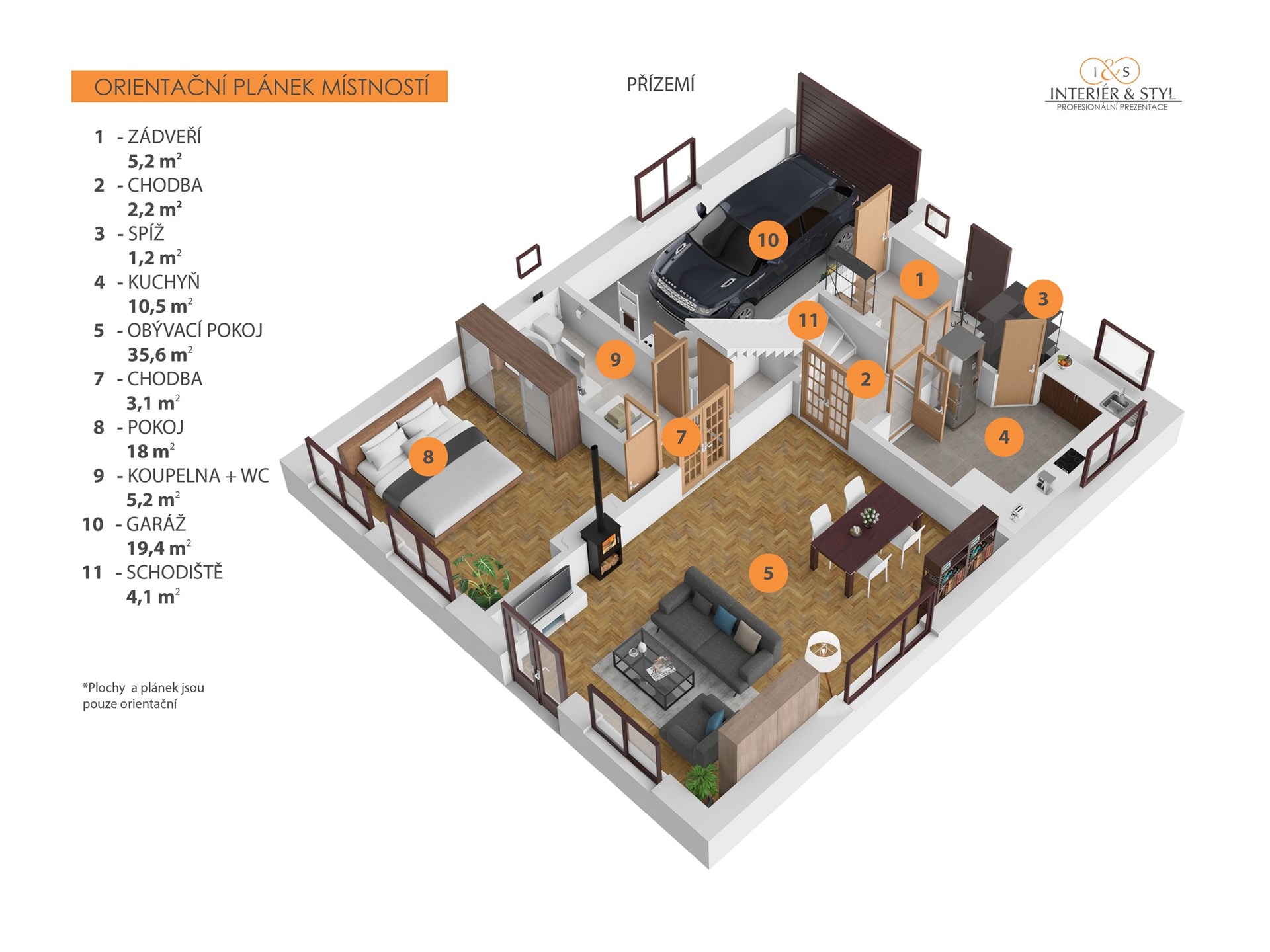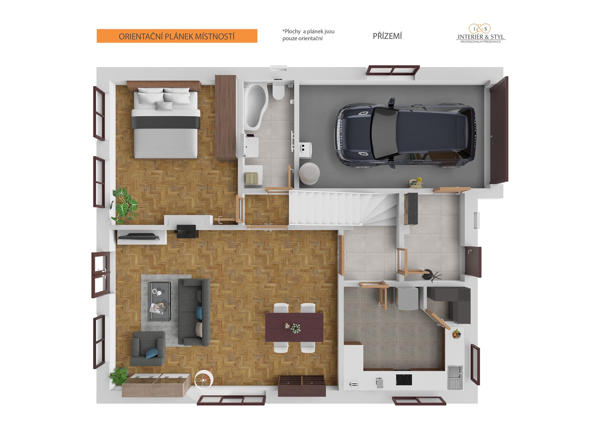 Parkování je bezproblémové díky garáži a dalším venkovním parkovacím místům.