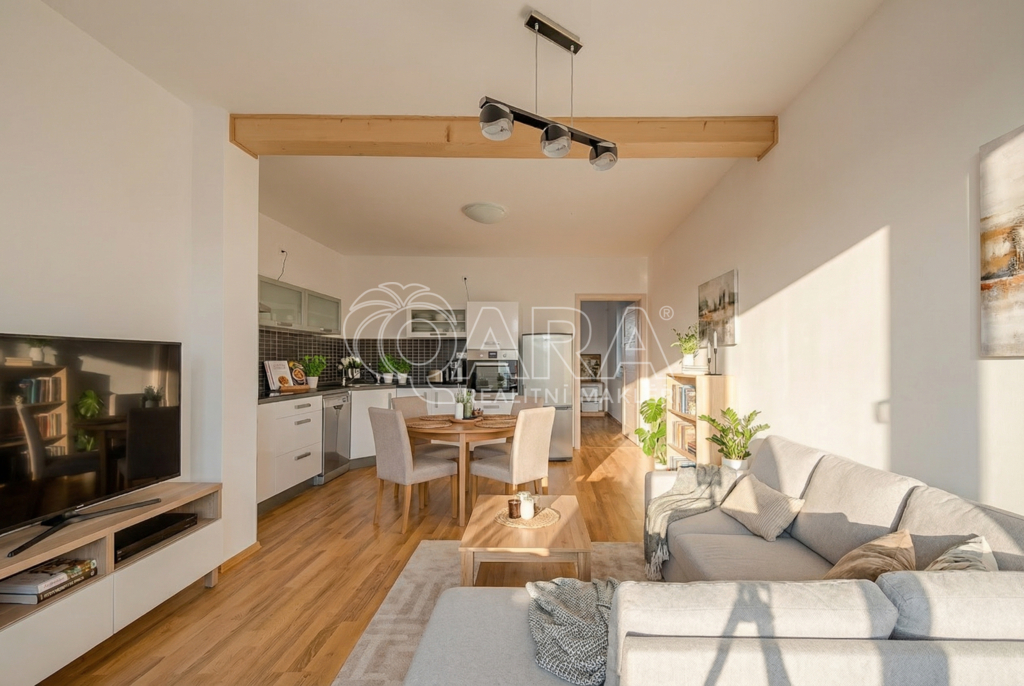 Dispozice: 1. NP - vstupní hala se schodištěm, prostorný obývací pokoj s kuchyňským koutem, spíží, krbovými kamny a vstupem na terasu (41 m2), samostatné WC, technická místnost (elektrokotel, akumulační nádrž na teplou vodu), šatna, a dále zádveří druhého vstupu, pokoj s kuchyňským koutem (15 m2), pokoj (10,2 m2), koupelna se sprchovým koutem a WC.