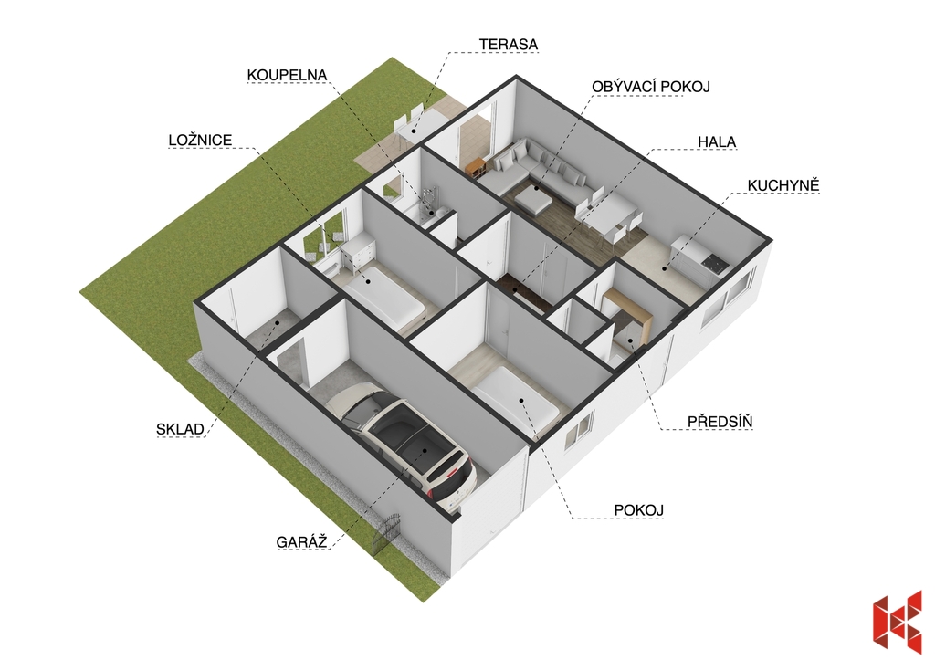 ✔ Dispozici 3+kk s možností úpravy na 4+kk při změně garáže na pokoj