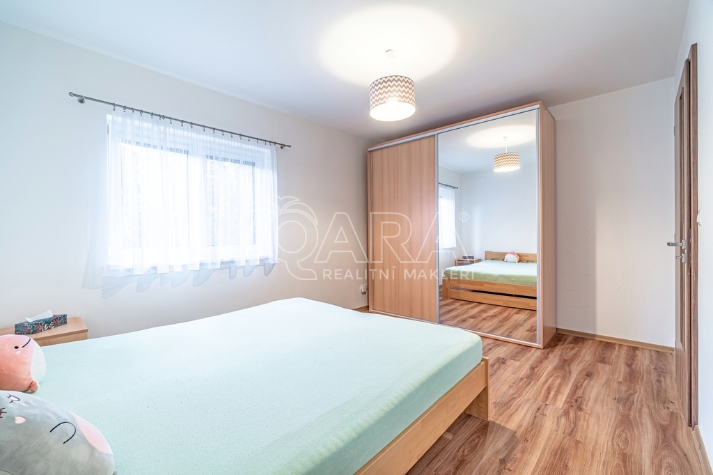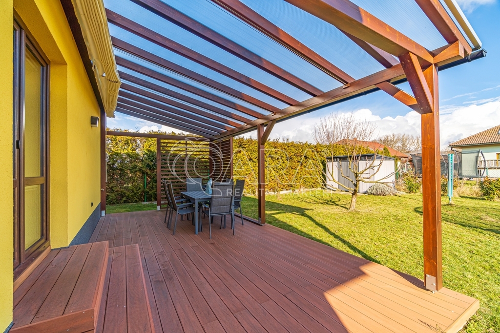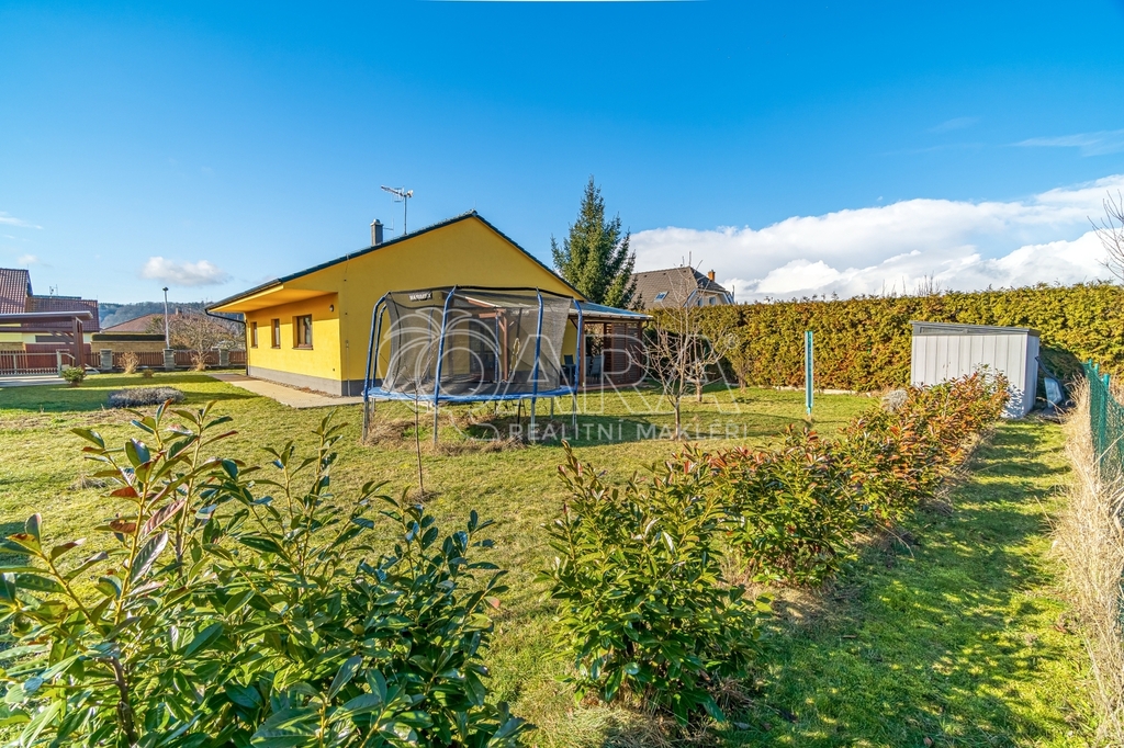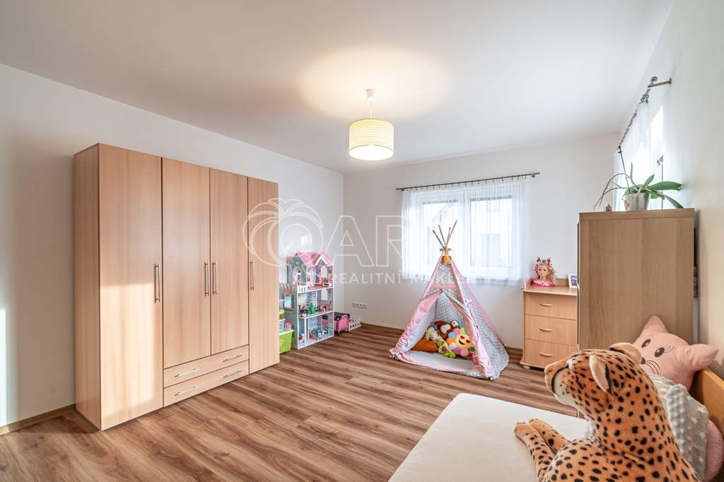Dispozici domu tvoří zádveří se šatnou, technická místnost s elektrokotlem a bojlerem, chodba, koupelna s vanou i toaletou, další samostatné WC, dva dětské pokoje, ložnice a prostorný obývací pokoj s kuchyňským koutem, odkud je přímý vstup na zastřešenou terasu.