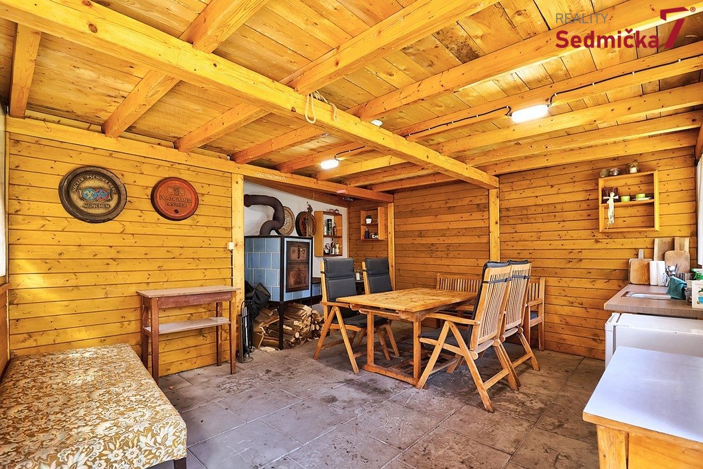 K bytu patří sklep, 1/3 společného sklepa, zahrada s dřevníkem, 2 parkovací místa, pergola s elektřinou, vodou, odpadem a kamny, majitel může navíc využívat 2 horní podesty na schodišti.