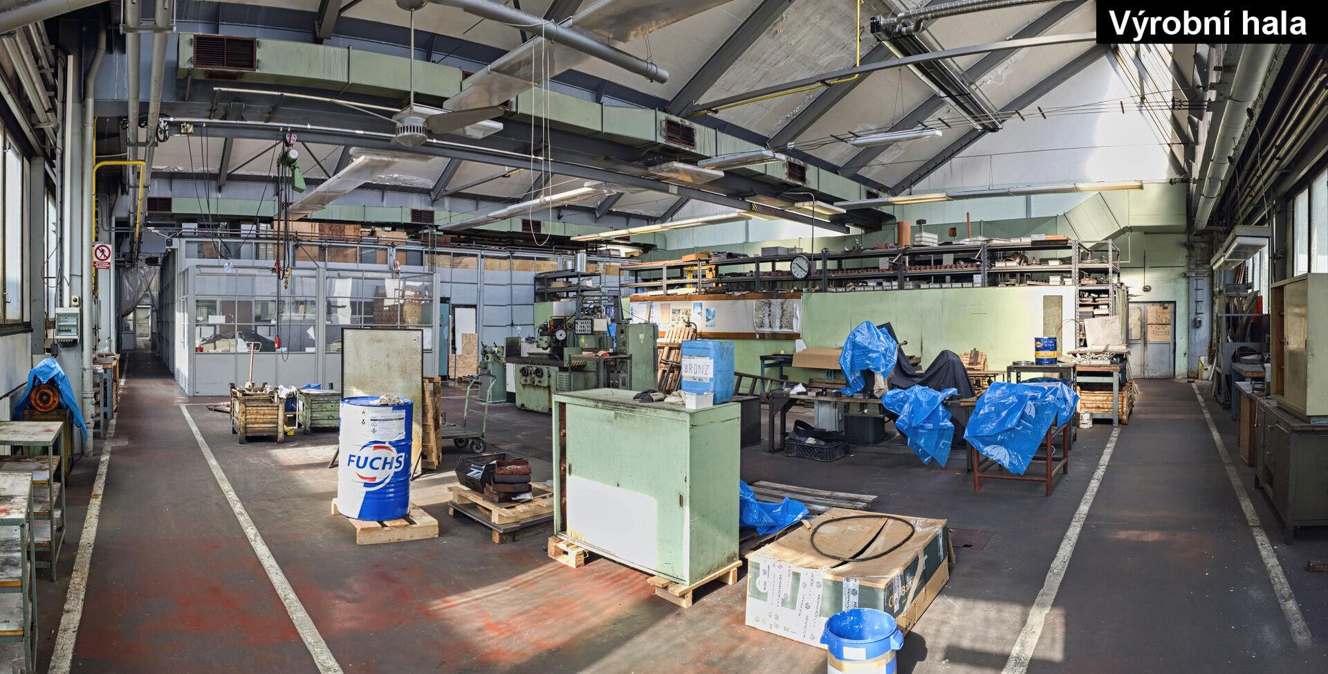 Výrobní hala opláštěná montovanými panely s bohatým prosklením a střešními světlíky; světlá výška haly pod vazník 4,2 m; betonová podlaha, osvětlení, elektroinstalace. Celková zastavěná plocha haly dle KN činí cca 5.400 m2 - k pronájmu se nabízí cca 1/2 haly; zbytek využívá vlastník areálu pro vlastní výrobu. K dispozici jsou prostory o výměrách 635 m2, 630 m2, 596 m2, 286 m2 a cca 400 m2.