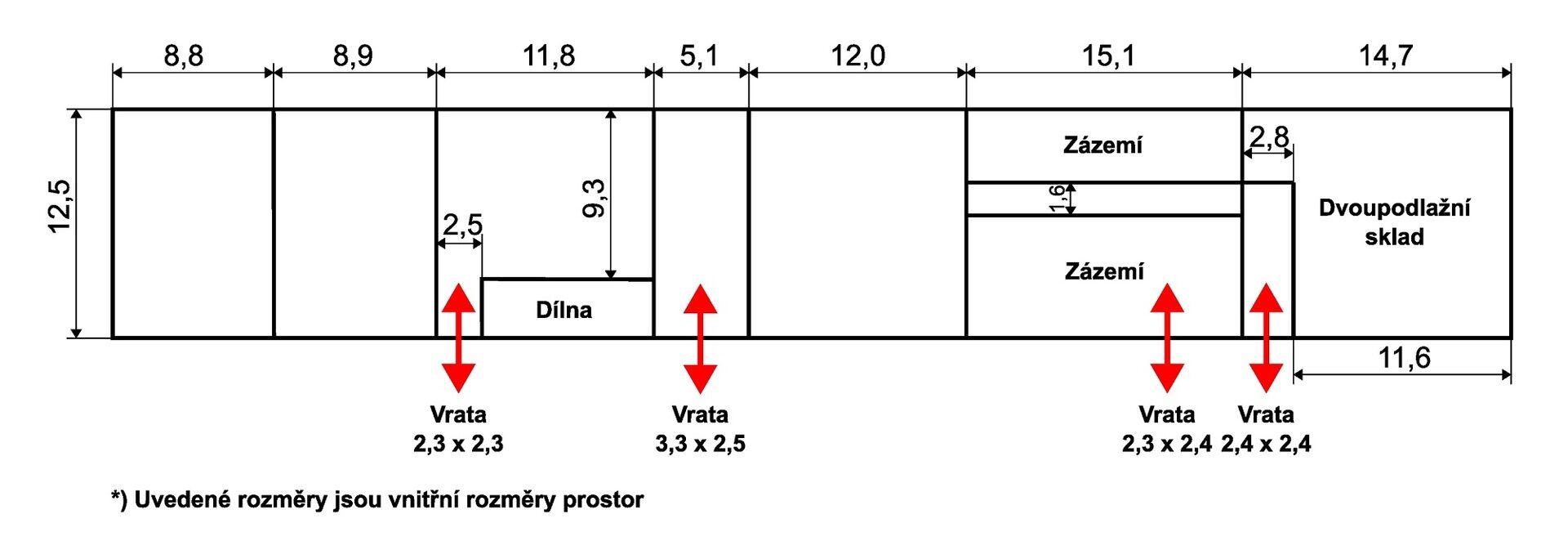 Možné výměry pronajatých skladových/výrobních ploch od cca 100 m2 až po celkem cca 3.200 m2.