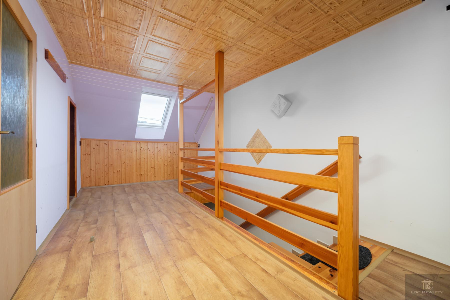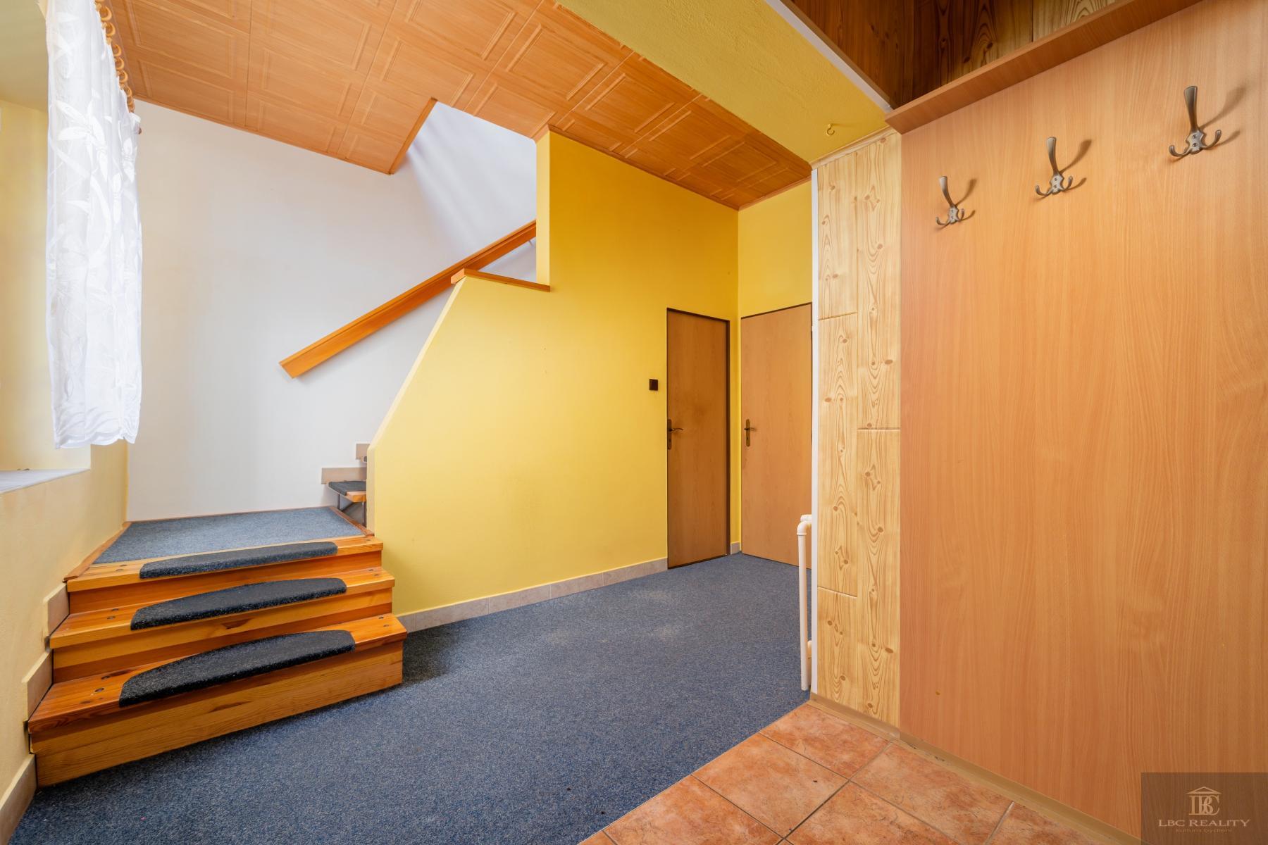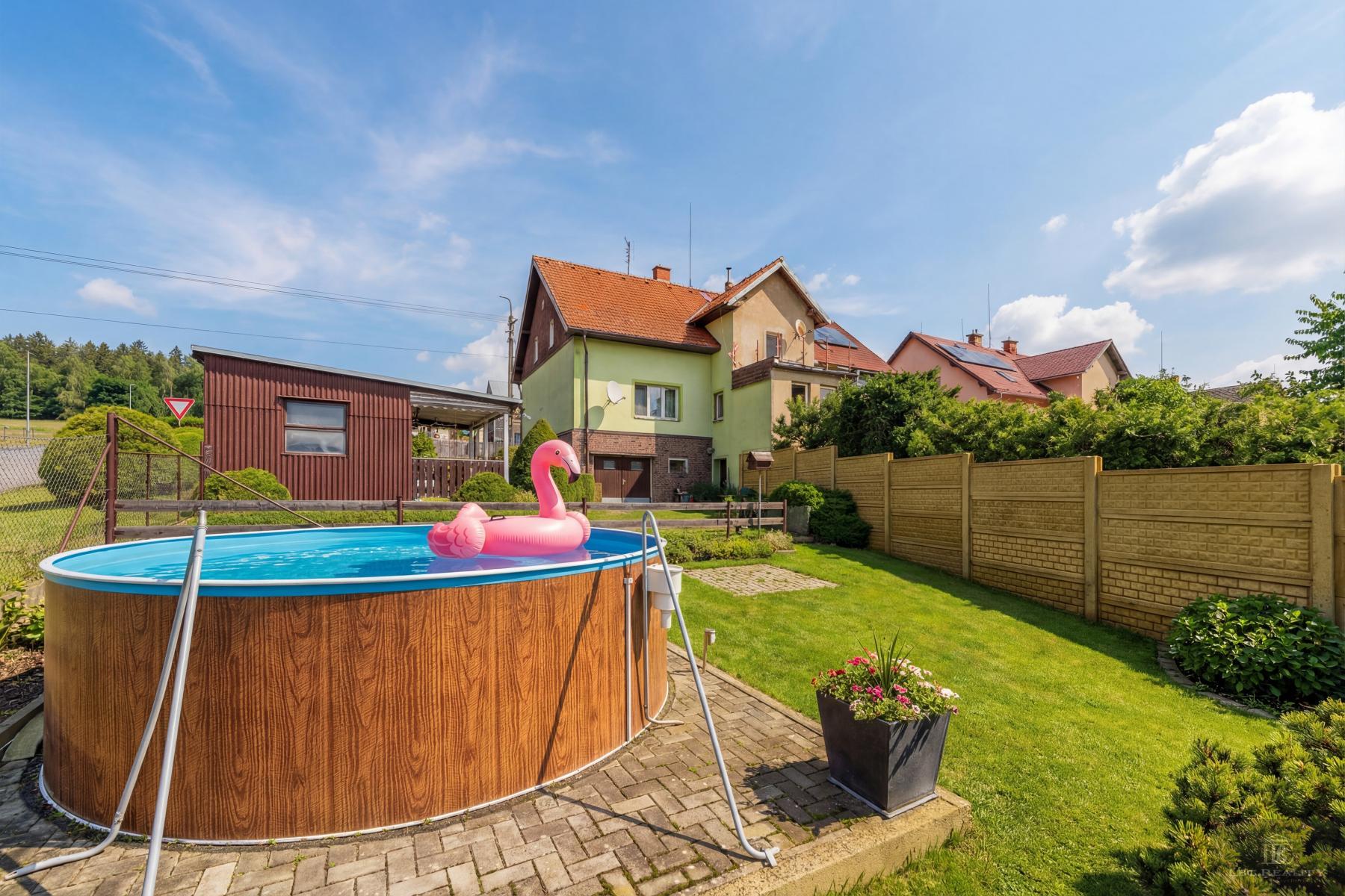 Součástí domu je zahrada s bazénem, která poskytuje příjemné soukromí pro odpočinek i letní posezení. Praktickým benefitem je také celkové podsklepení domu s velkorysými sklepními prostory, které ocení každý, kdo potřebuje místo pro dílnu, skladování nebo technické zázemí.