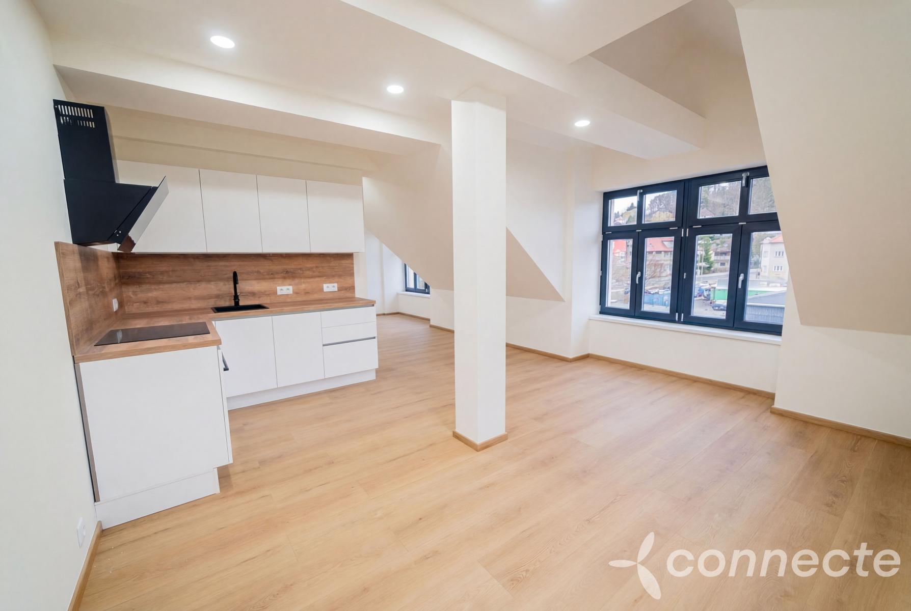 Prodej bytu 1+kk 45,3 m2 s obyvatelnou půdou, parkovacím stáním a kuchyní, projekt Rezidence Delta