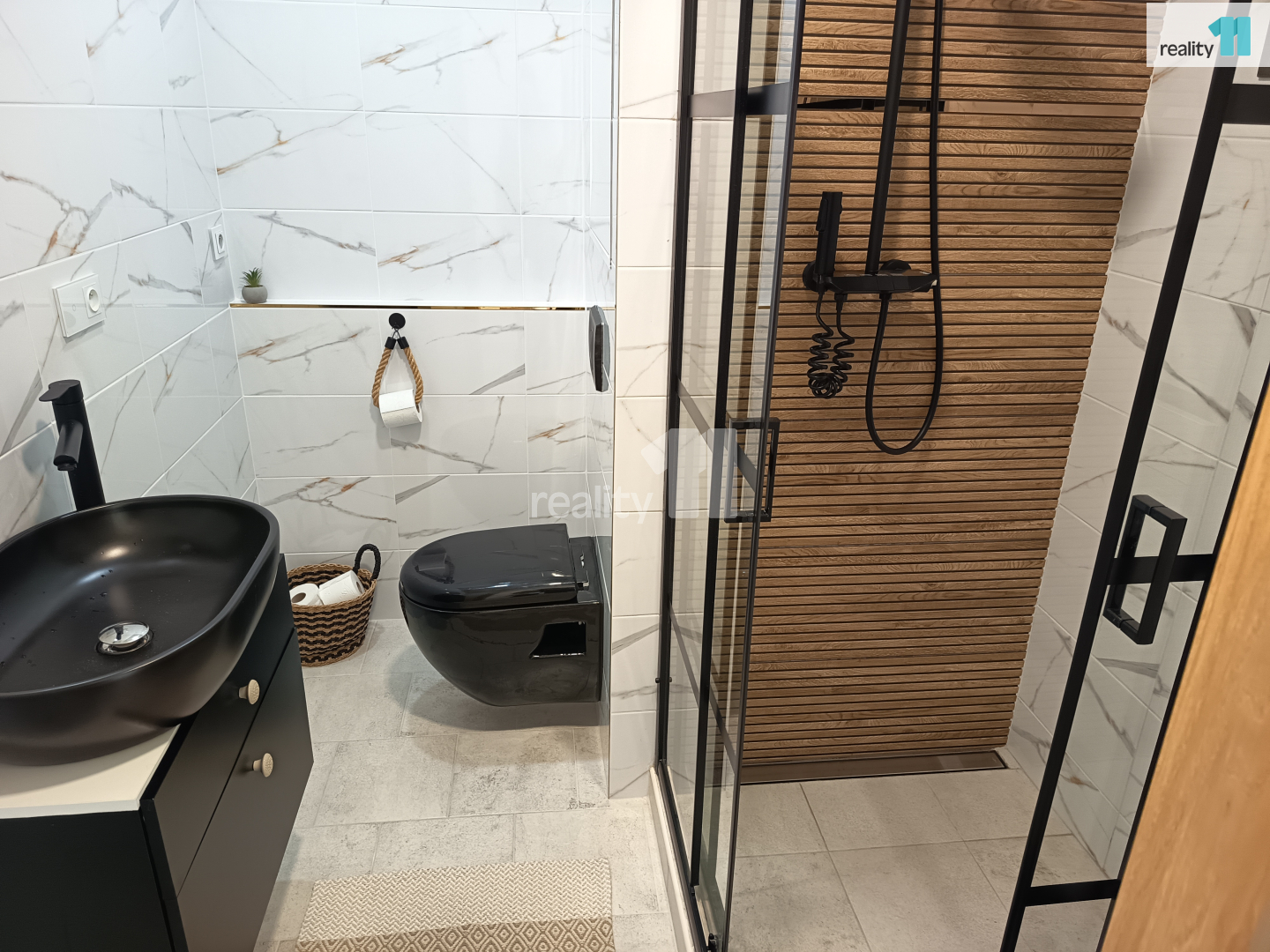•Kombinaci velkoformátových obkladů s mramorovým dekorem a dřevodekoru ve sprše