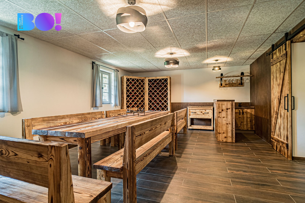 Přízemí domu je skutečnou perlou. Kompletní wellness, včetně vířivky BALBOA, sauny, odpočinkové části a sprchy vše doplněné o atmosféru hvězdného nebe. Vinný sklípek je ideální pro uskladnění oblíbených vín a posezení při degustaci.