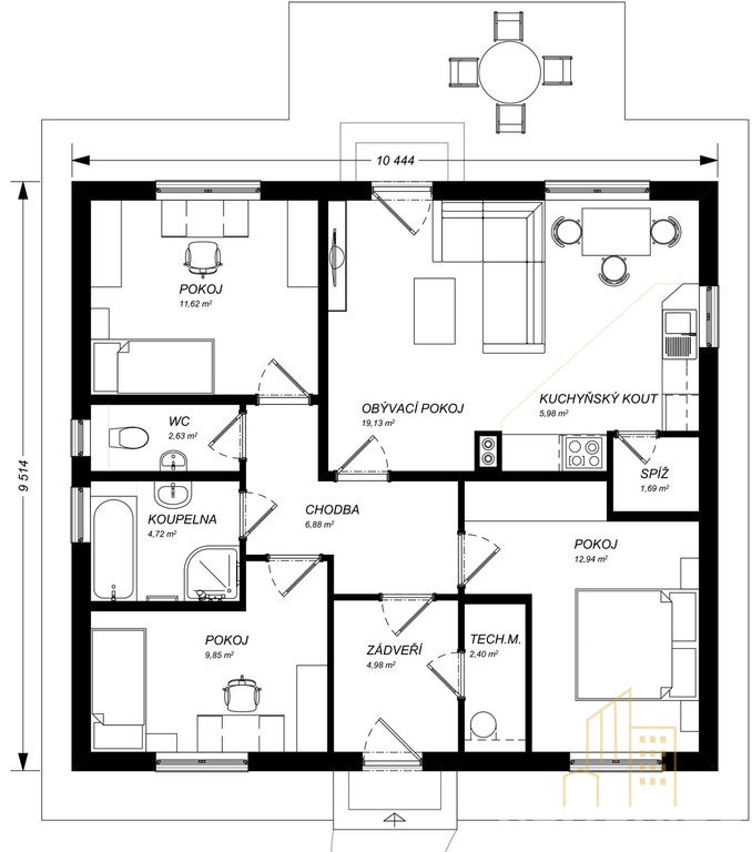 V domě naleznete ložnici a dva dětské pokoje, které poskytnou dostatek prostoru pro klidný spánek a soukromí každému členu rodiny. Součástí domu je také praktická šatna, technická místnost, samostatné WC a koupelna. Dům nabízí desítky variant uspořádání a designu, takže si můžete přizpůsobit interiér i exteriér přesně podle Vašich představ.