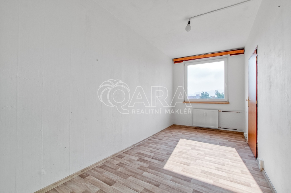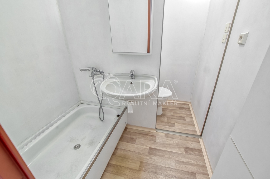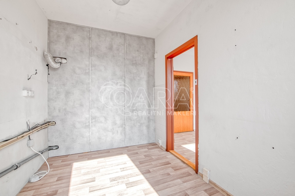 Kuchyňská linka je zde už odstraněná. Díky tomu vás nečeká žádné bourání staré plechové klasiky, která se v těchto bytech často objevuje a rozvody vody jsou připravené v plastu, takže máte o kus práce méně a můžete rovnou řešit finální podobu podle sebe.