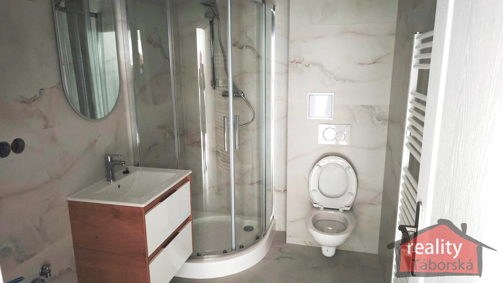V koupelně je sprchový kout, umyvadlo se skříňkou, osvětlené zrcadlo, topné těleso, toaleta a prostor na pračku s připravenými vývody na vodu a odpad.