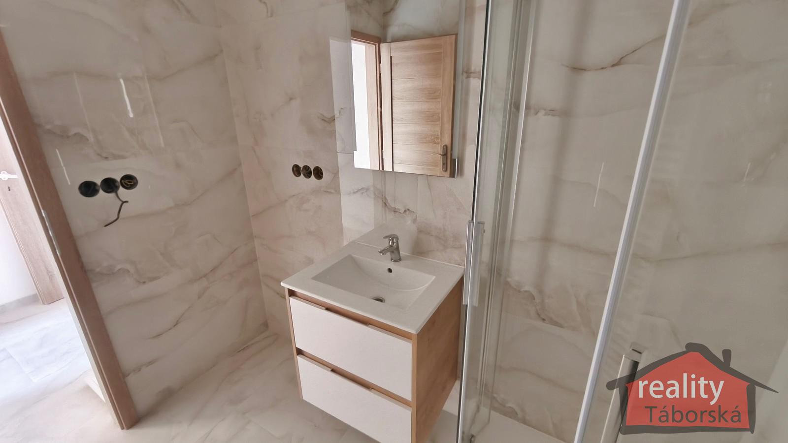 V koupelně je sprchový kout, umyvadlo se skříňkou, osvětlené zrcadlo, topné těleso, toaleta a prostor na pračku s připravenými vývody na vodu a odpad.