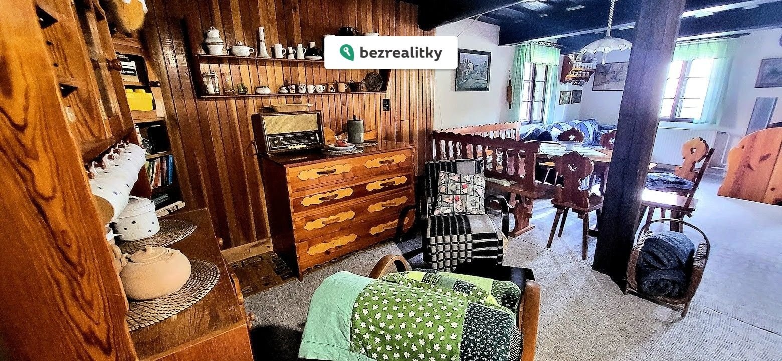 4+kk: 2 ložnice, 1 místnost pro relax (herna), hlavní obývací místnost s funkčními kachlovými kamny a kuchyňským koutem, koupelna s vanou, samostatné WC, krásný klenutý prostorný sklípek (spižírna, vinotéka) přímo v chalupě. Stodola (dřevo, úschovna na kola, běžky), technická místnost (kotelna). Obecní vodovod, elektřina (vytápění elektrokotlem, rozvedeno po domě - radiátory, lze zapnout přes mobil na dálku, je zde i druhý kotel na dřevo, úsporná sazba D57d pro el. kotel zavedena), kanalizace (splachovací wc). Zavedené na pronájmy v turistice + pronajatá přilehlá parcela p.č. 66 (130 m²) za symbolickou cenu od obce hned za chaloupkou (desítky let k užívání). Skvělá investice. Blízko top atrakcí: