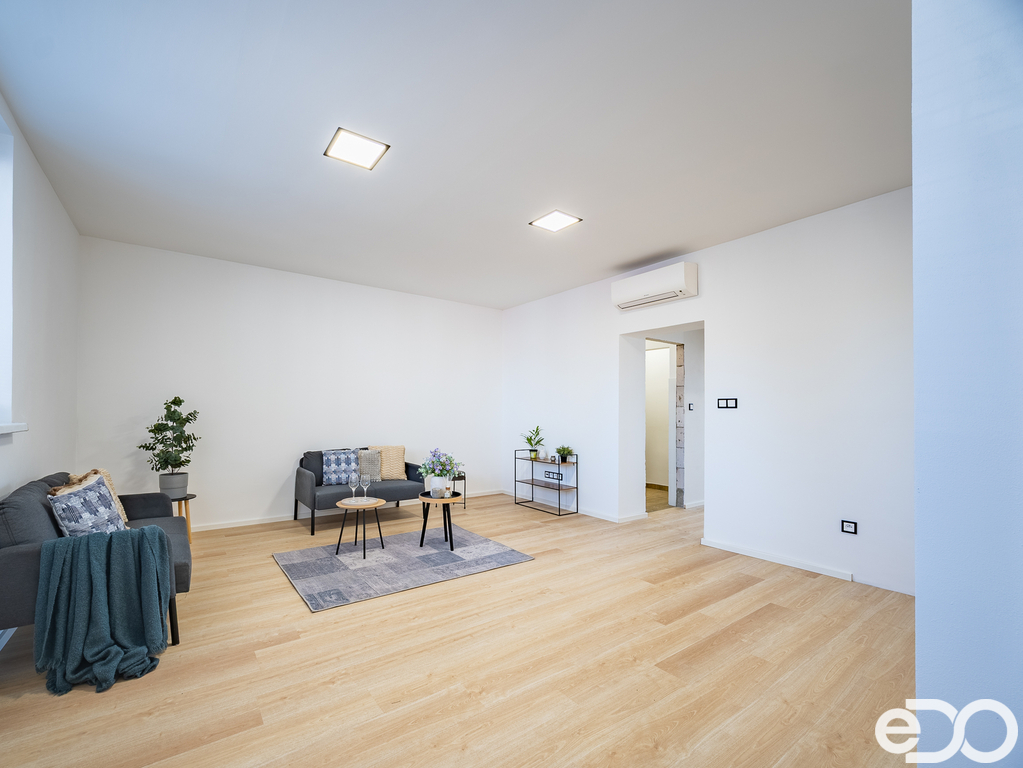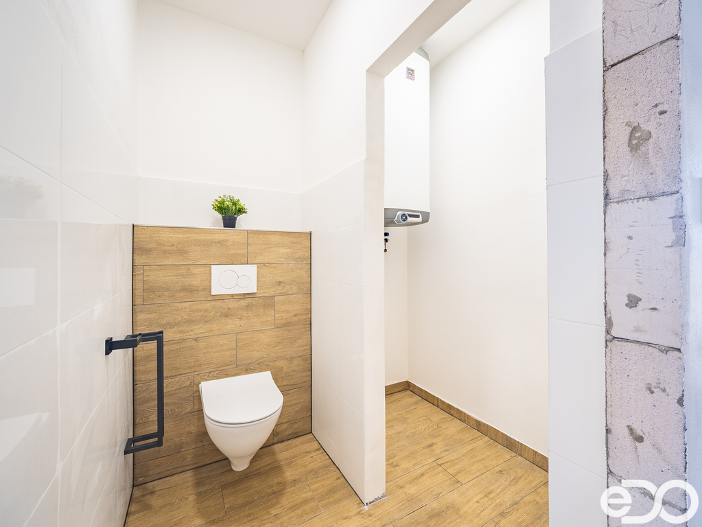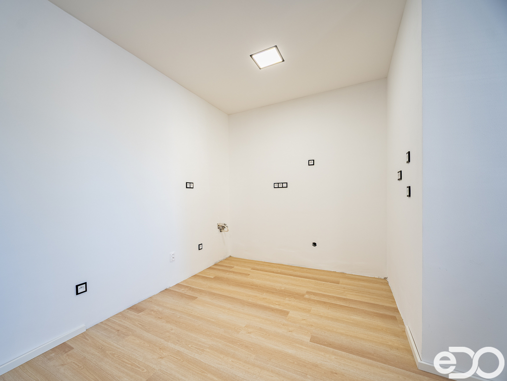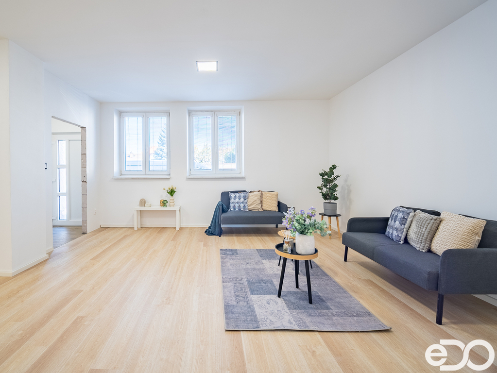Velkou výhodou je, že interiér je připraven k finálnímu doladění dle vlastních představ – chybí kuchyňská linka a vnitřní dveře včetně obložek, což umožňuje novému majiteli dokončit si bydlení přesně na míru.