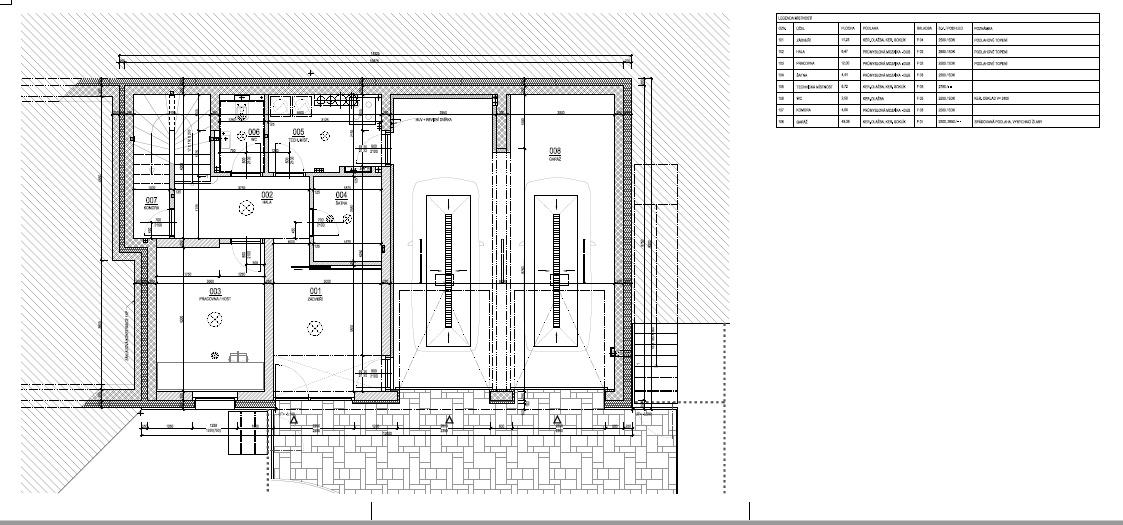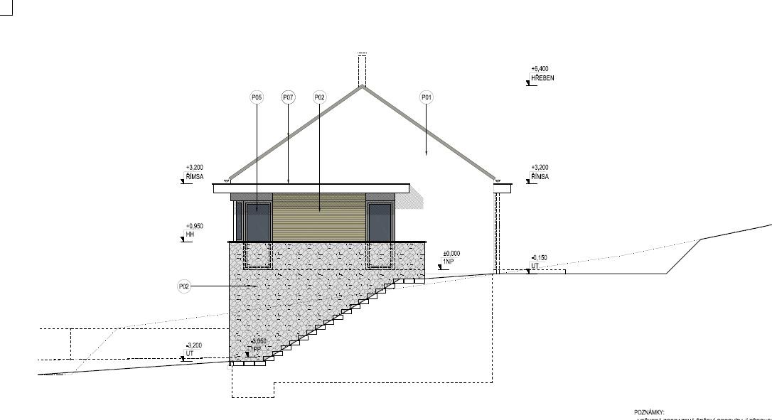 1. PP - technické: zádveří, vstupní hala, WC, technická místnost, pracovna, garáž pro dva automobily;