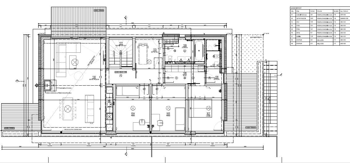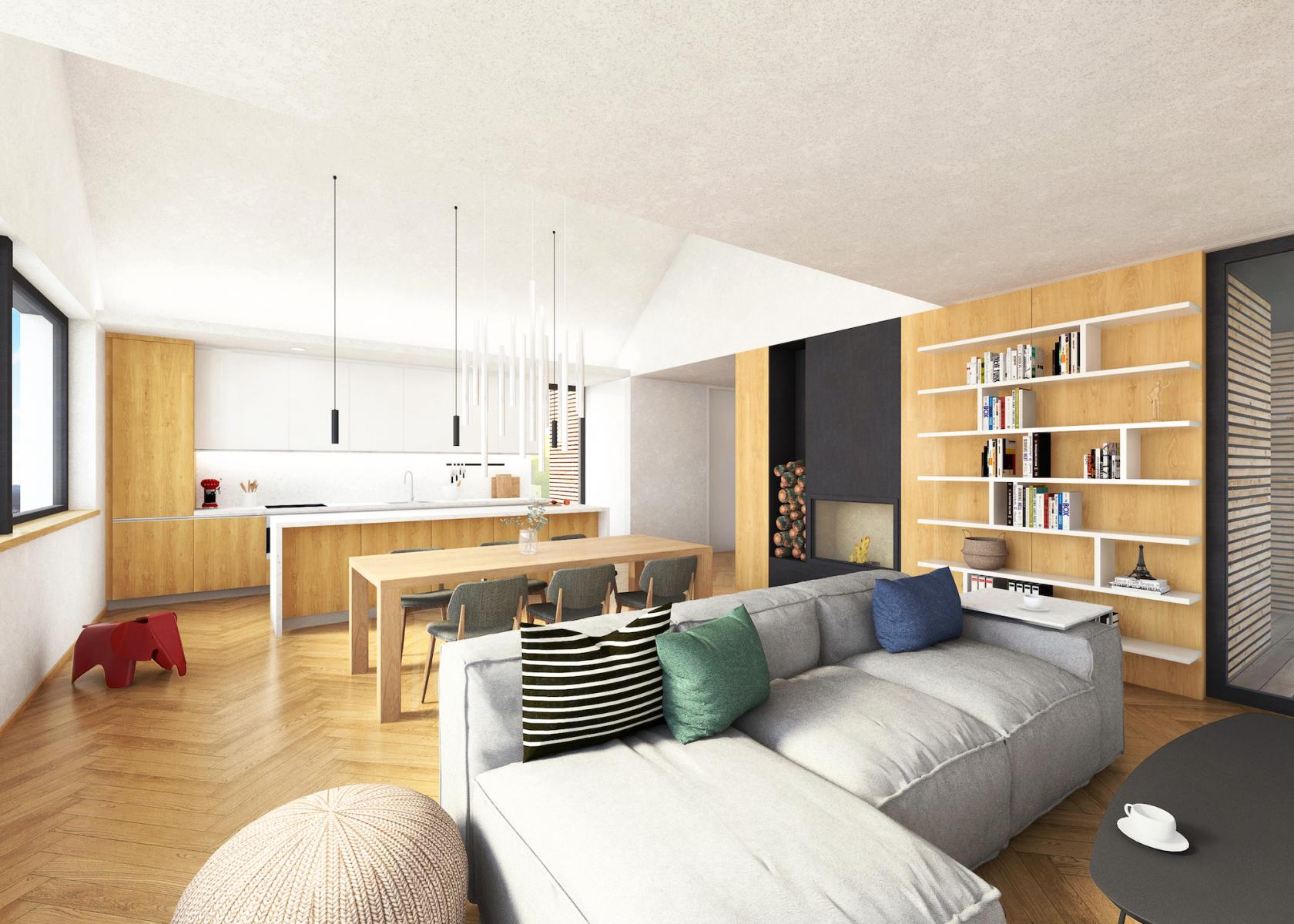 1. NP obytné: hala, obývací pokoj s kuchyňským koutem (48 m2, v obytné části s výškou stropu 4,5 m), dva pokoje (12,5 m2;12,5 m2), ložnice s vlastní šatnou, koupelnou a toaletou (24 m2), koupelna společná s toaletou, vstup na tři terasy a do zahrady.