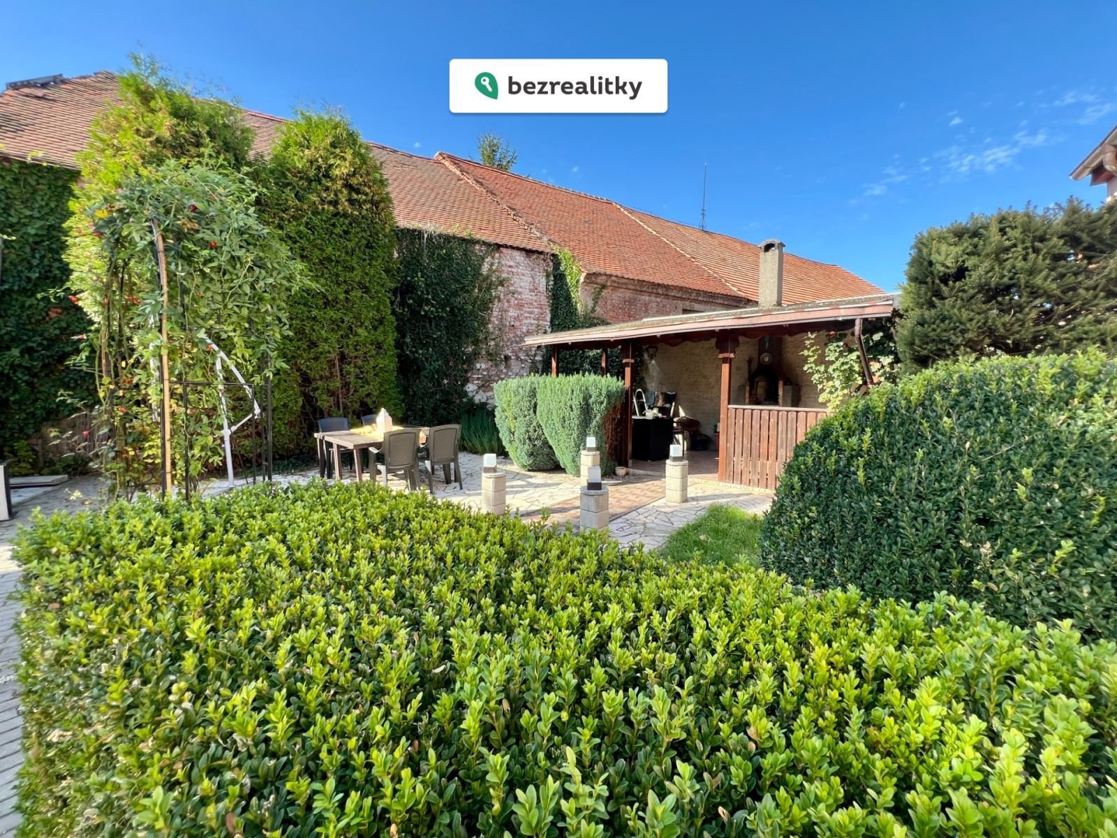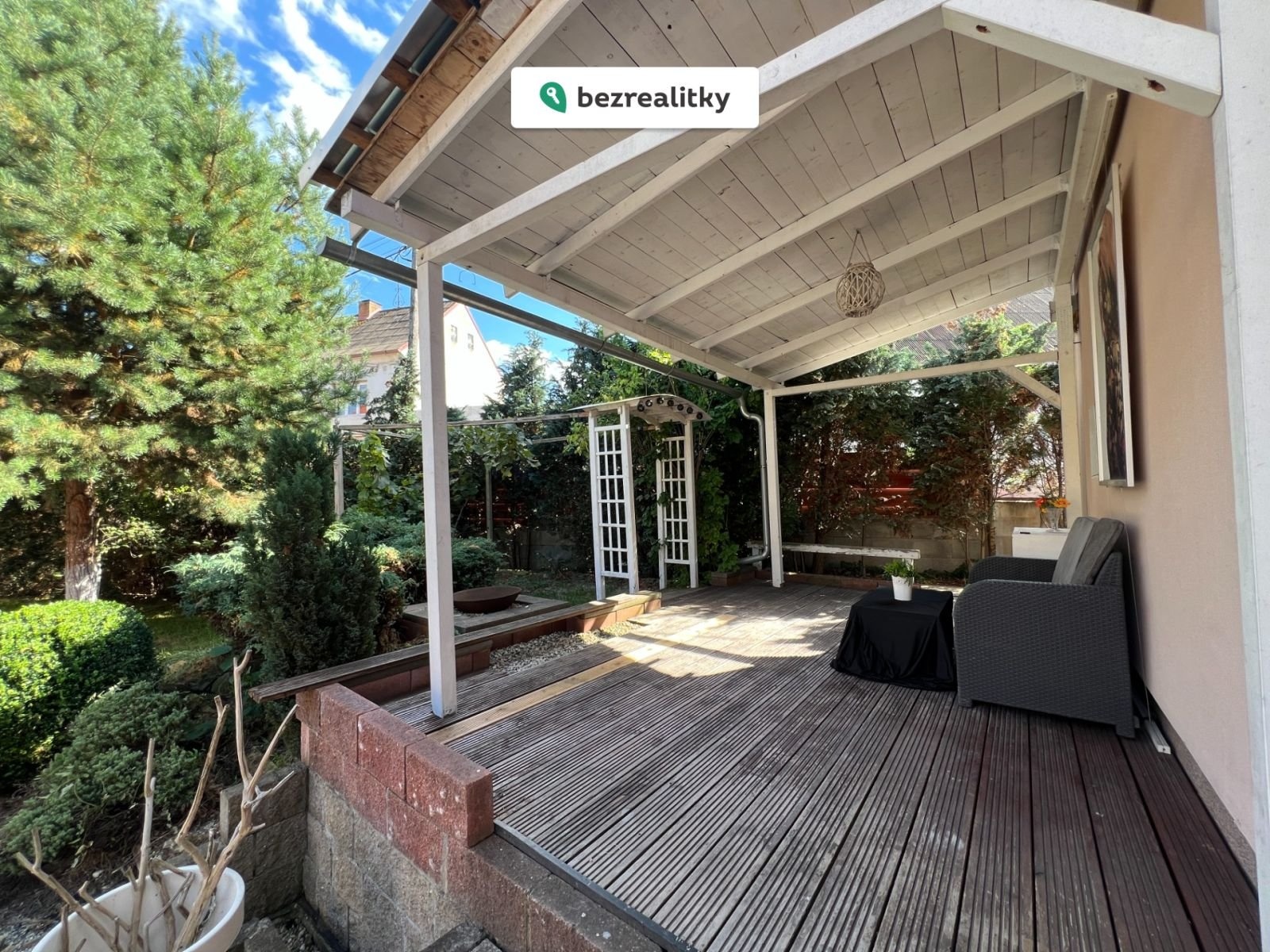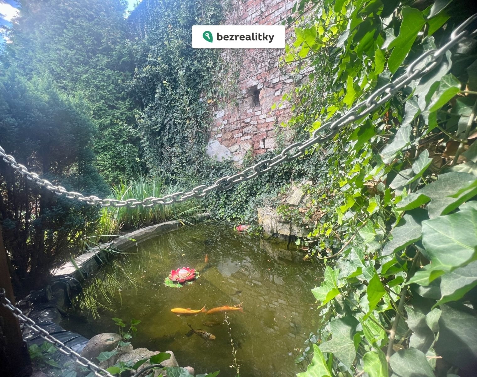 Zahrada poskytuje maximální soukromí a klidné prostředí. Díky vzrostlé zeleni není do dvora vidět ani z ulice, ani od sousedů. Součástí pozemku jsou dvě kryté terasy, jezírko a udržovaná zeleň s ovocnými stromy. Nemovitost je napojena na veřejný vodovod a kanalizaci a disponuje dvěma studnami, z nichž jedna slouží jako zdroj pitné vody a druhá je využívána pro zavlažování.