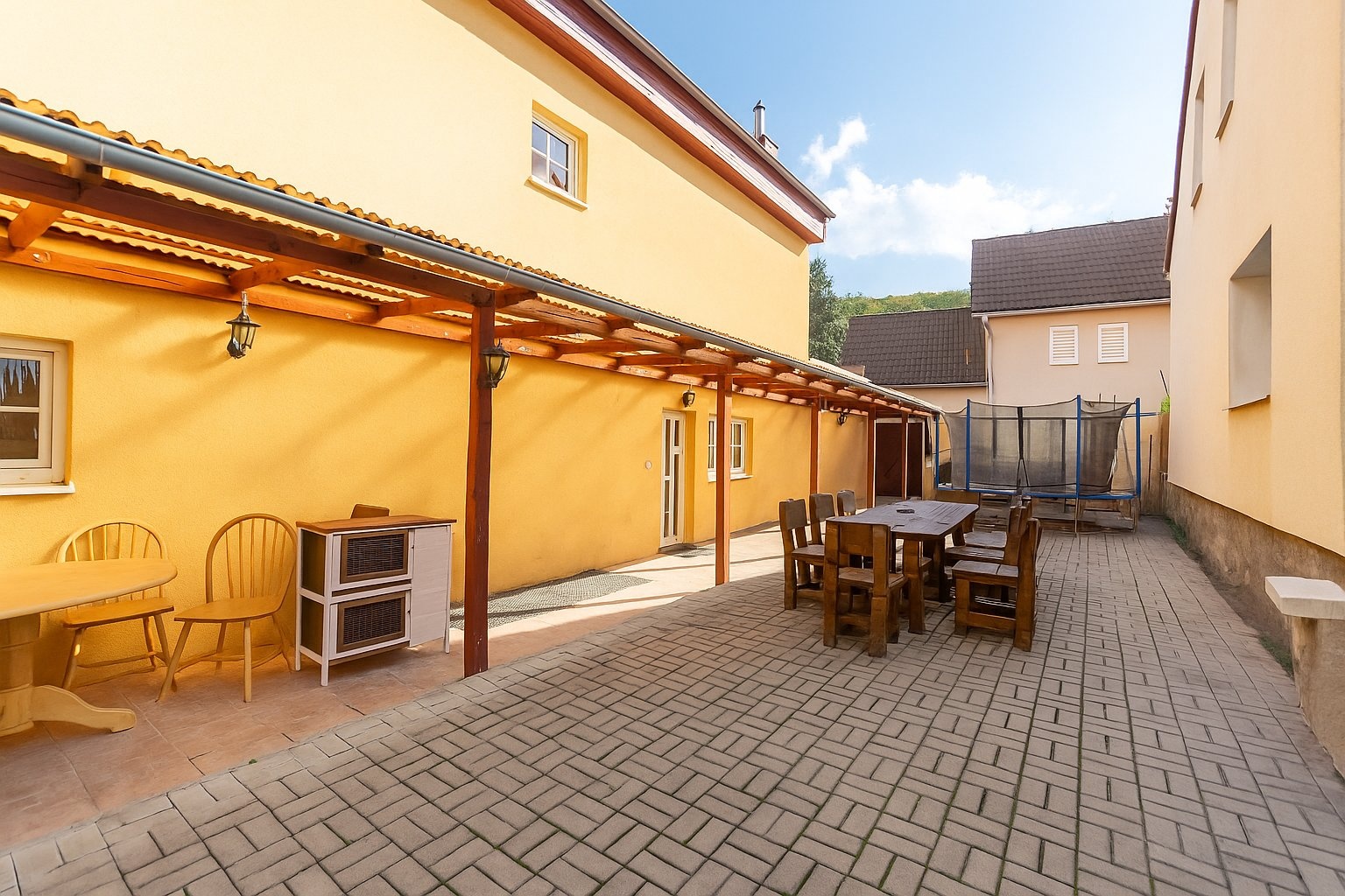 Před domem se rozkládá pozemek – ideální pro parkování, odpočinek nebo zahradní relaxaci. Vedle vstupu je zámková dlažba a po celé délce domu zastřešená pergola, která nabízí příjemné místo pro setkání s rodinou či přáteli.