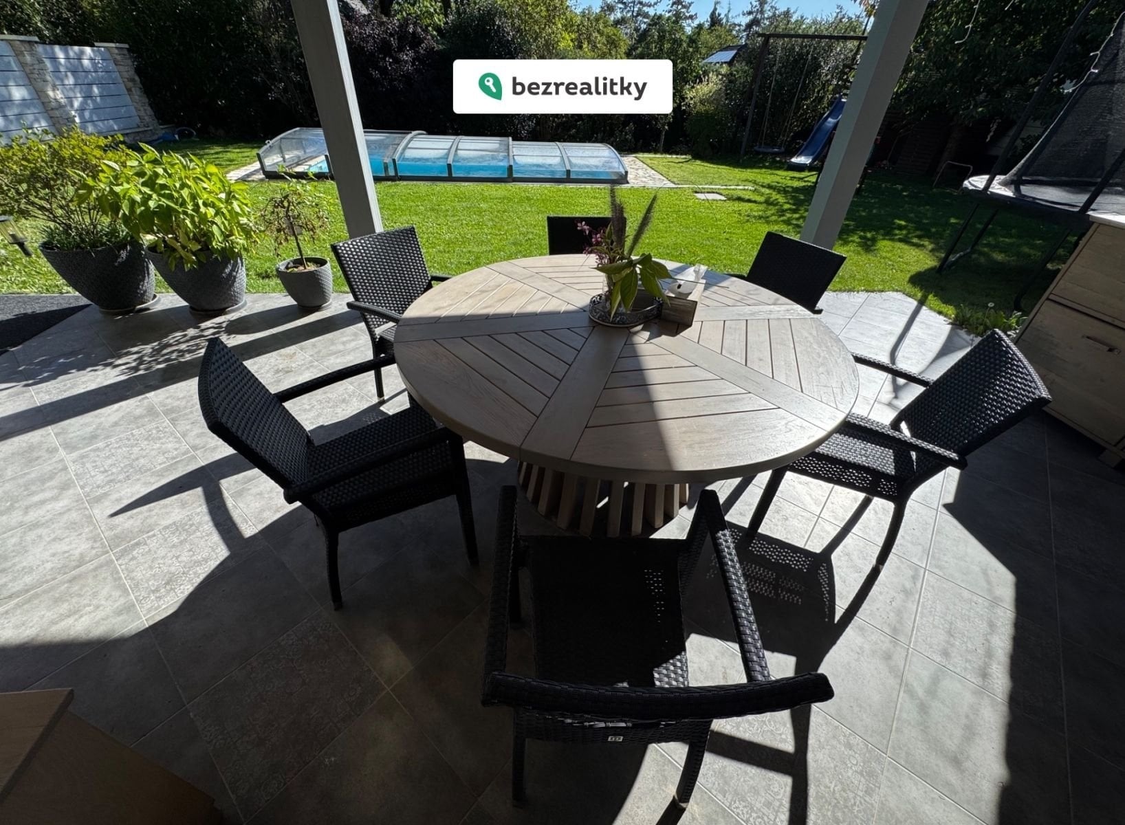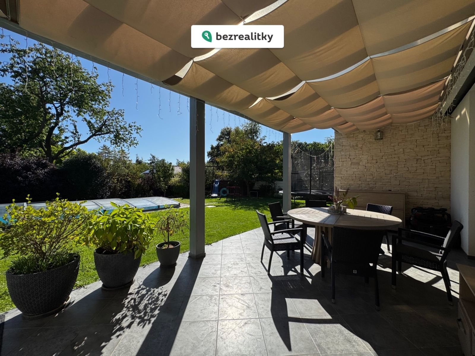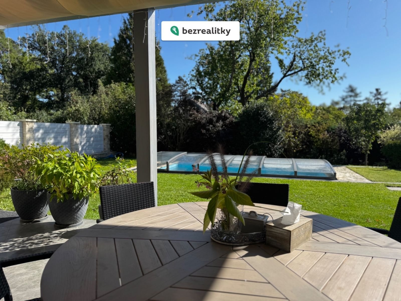 Zahrada s již vzrostlými stromy a okrasnými keři je orientovaná na jih a disponuje automatickým závlahovým systémem.