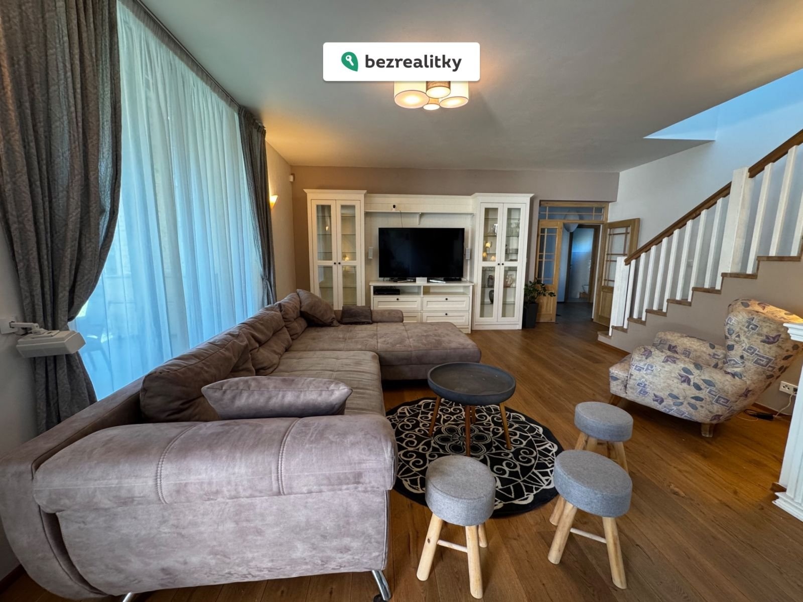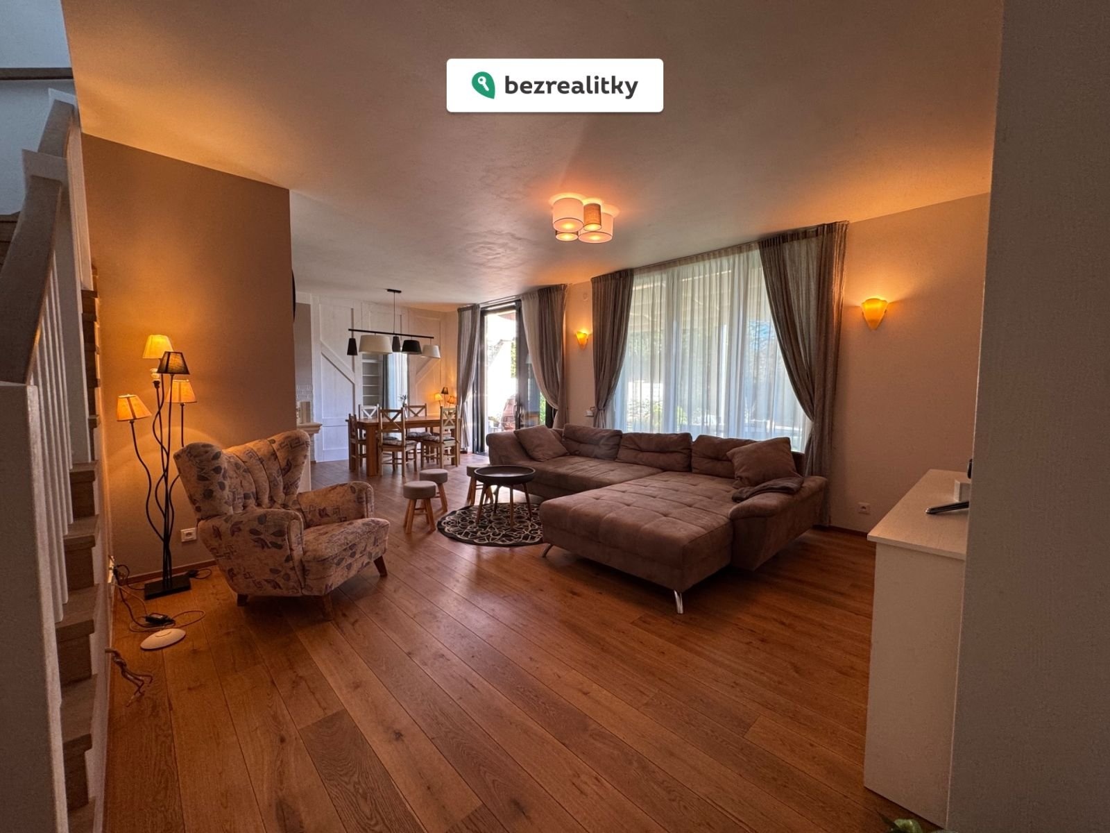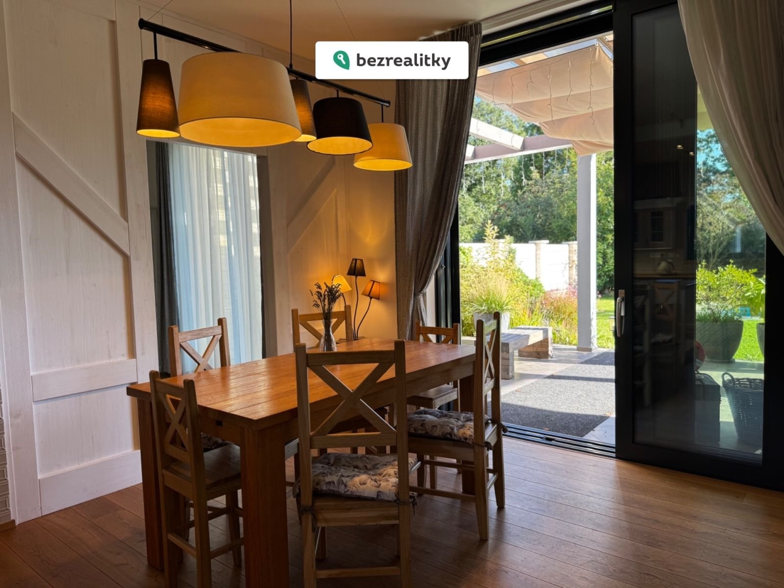 Masivní dřevěné podlahy, nadstandardní výška stropů, velké hliníkové prosklené plochy a propojení obytného prostoru se zahradou pomocí HS portálů dodávají domu světlost, vzdušnost a nadčasovou estetiku. Ihned k nastěhování.