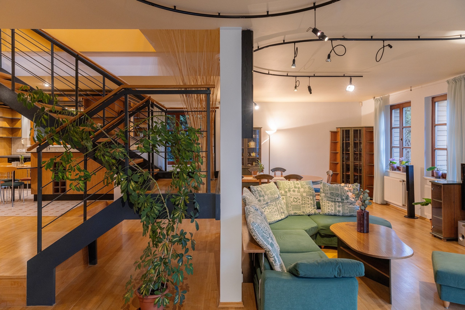 Obytnému prostoru vévodí skoro 120 metrový obývák s kuchyní, ve kterém nesmí chybět krb. Opticky lehké schodiště propojuje srdce domu s ložnicemi, které vás čekají 4 (velikosti 19 m2). Nahoře pak několik šaten, dvě koupelny. Rodiče fungují ve své samostatné zóně tak, aby nebyli rušení s provozem dětským pokojů. Však byla návrhu domu věnována náležitá pozornost, nejedná se o žádnou okopčenou vzorovku.