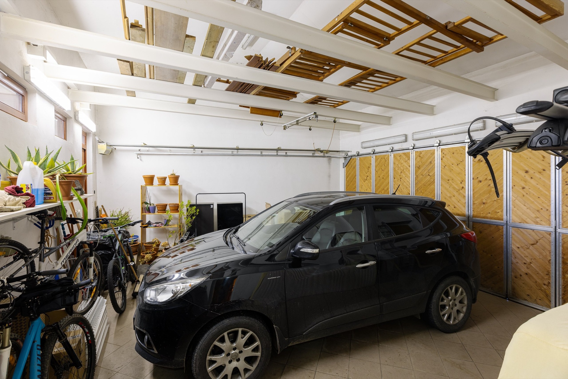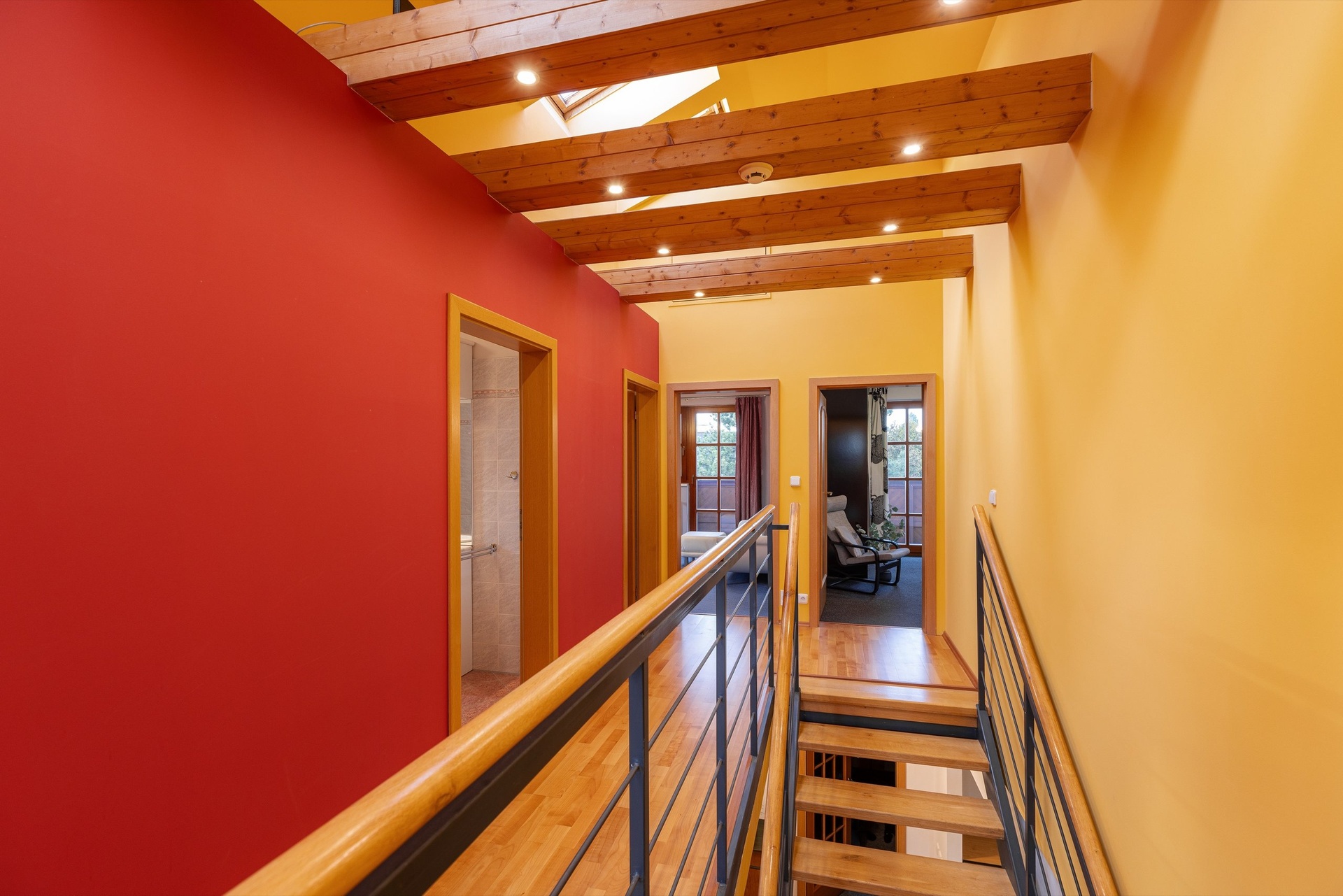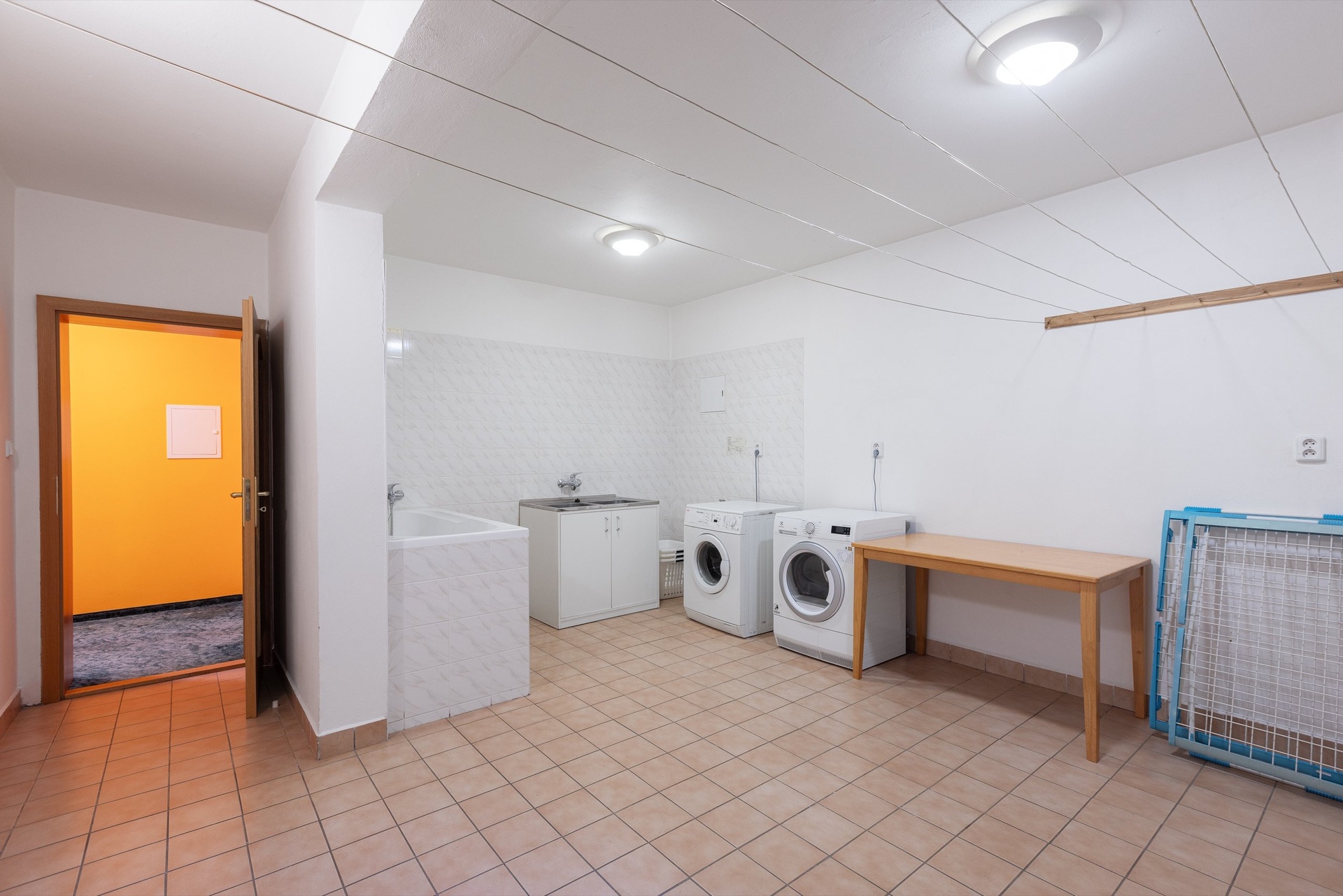 Prakticky smýšlející zaujme suterén, který funguje jako regulérní podlaží. Tedy nejen dílna, obrovská prádelna, úložné prostory a velká wellness zóna (sauna, vířivka, posilovna, 47 m2), ale také místnost pro pracovnu či pokoj pro hosty. Spoustu místa nabízí také velká a vysoká garáž, ve které lze umístit další patro (na stávající traverzy).